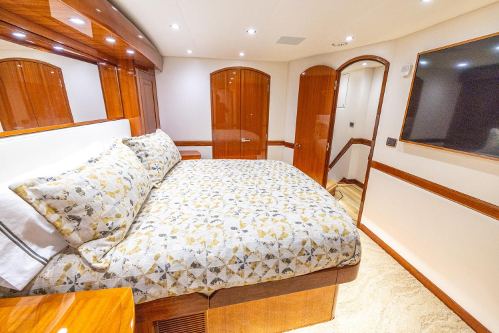 Moving down the steps forward you first come to the master stateroom to starboard. This large room features a king berth, large head with shower, hanging locker and several drawers for storage. A 52” flatscreen TV with Bose Surround sound. Across the hall is a bunk room with ample storage provided by hanging locker and drawers. This room features its own entertainment system as well. Moving forward past the day head and closet housing the washer and dryer, and forward of the reel storage locker, you find the VIP stateroom. A walkaround, centerline queen bed offers storage below and above port and starboard storage. This room features a 42” Samsung TV, hanging lockers port and starboard, and large ensuite head with custom marble shower.