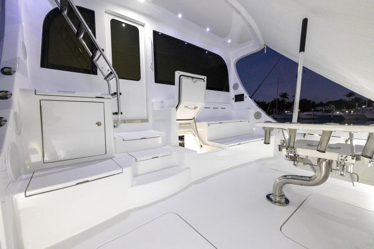 Upon stepping on the boat, you are immediately enthused by the large 205 sq ft cockpit. One step up, the mezzanine offers ample seating with air conditioning and full view of the cockpit. A BlueWater Chairs fighting chair sits predominantly in the middle. Large fish boxes plumbed with chipped ice, ice chests, integrated freezer boxes, refrigerated drink box, insulated bait boxes, windowed transom live well, and a tackle center all combine for a very well laid out cockpit.