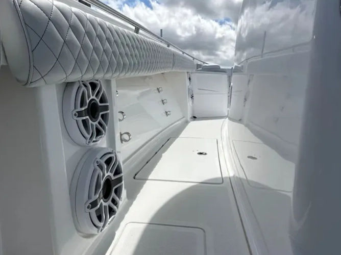 - Oversized fiberglass hardtop w/ RGBW lighting, spreader lights & rod holders