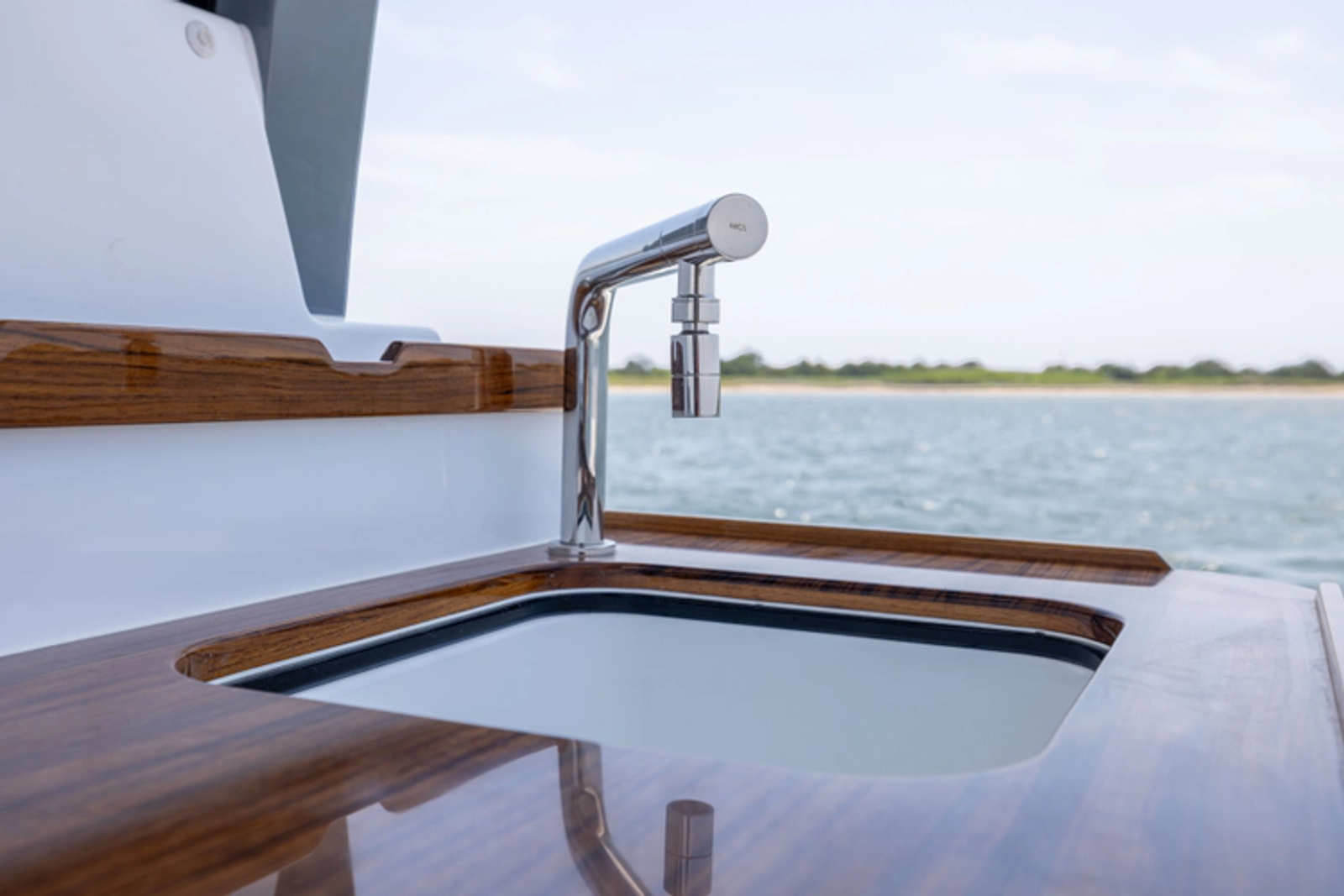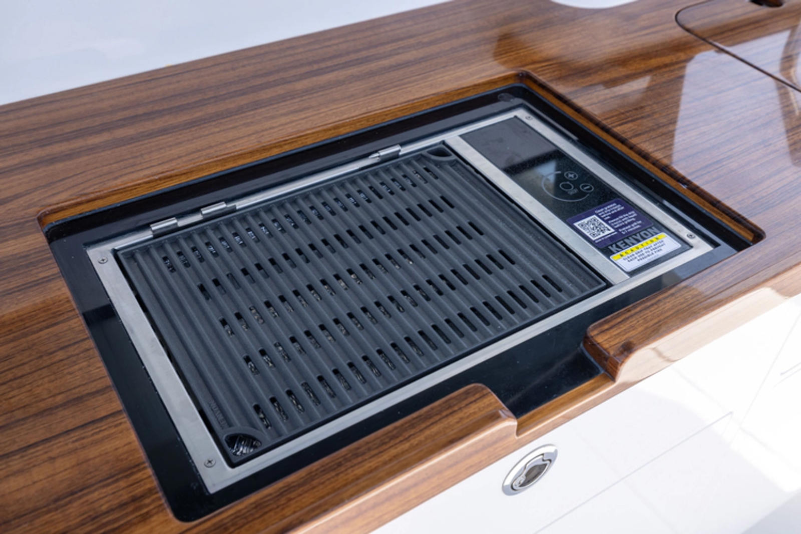 Summer Kitchen with Corian countertop, freshwater sink, swivel faucet, tackle/gear storage, single burner electric grill, and 12V refrigerator