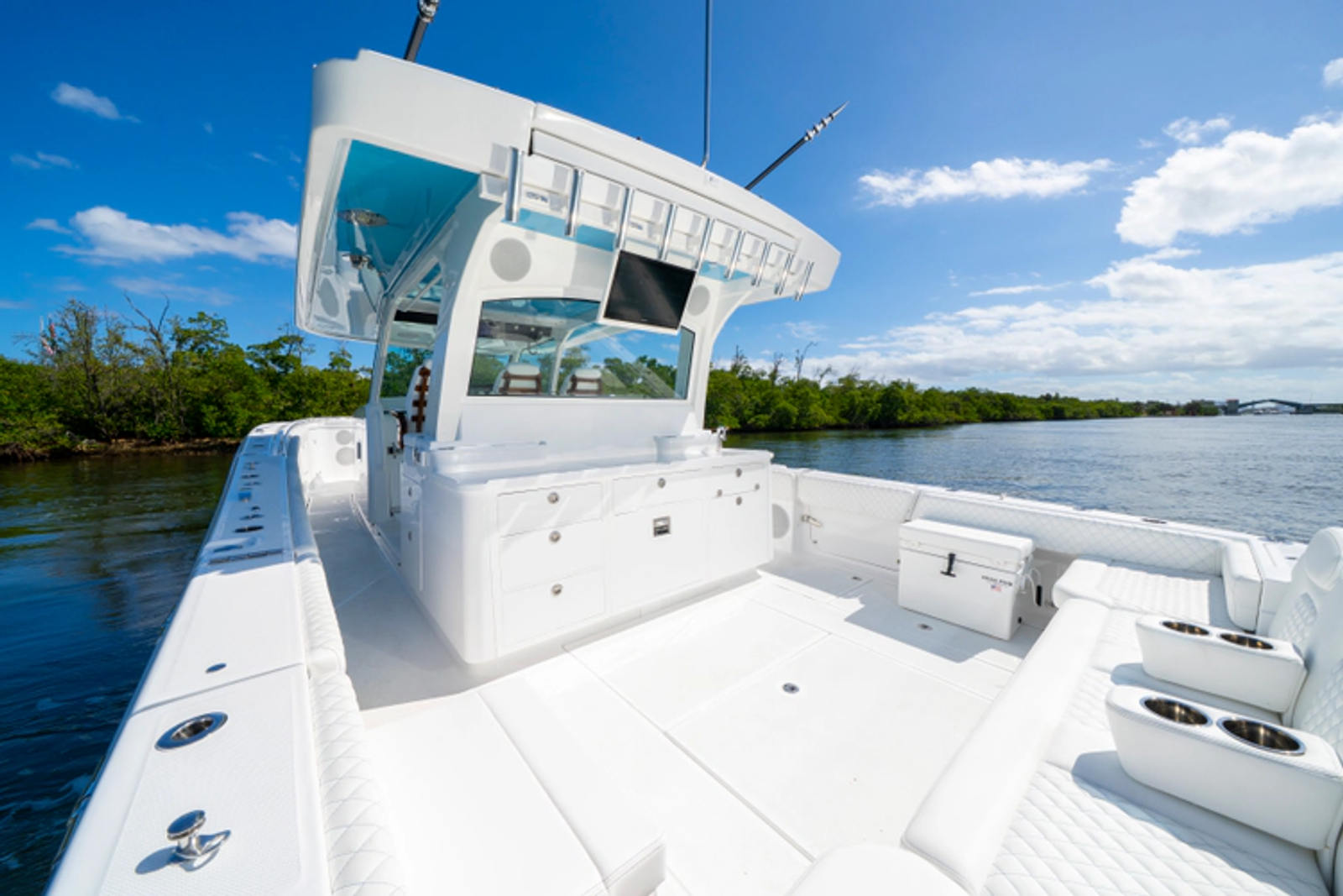 Rear Facing Summer Kitchen with Integrated Grill, Freshwater Sink, Refrigerator, and Tackle Storage