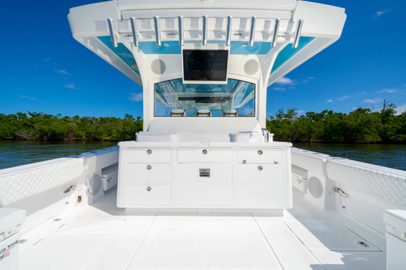 Rear Facing Summer Kitchen with Integrated Grill, Freshwater Sink, Refrigerator, and Tackle Storage