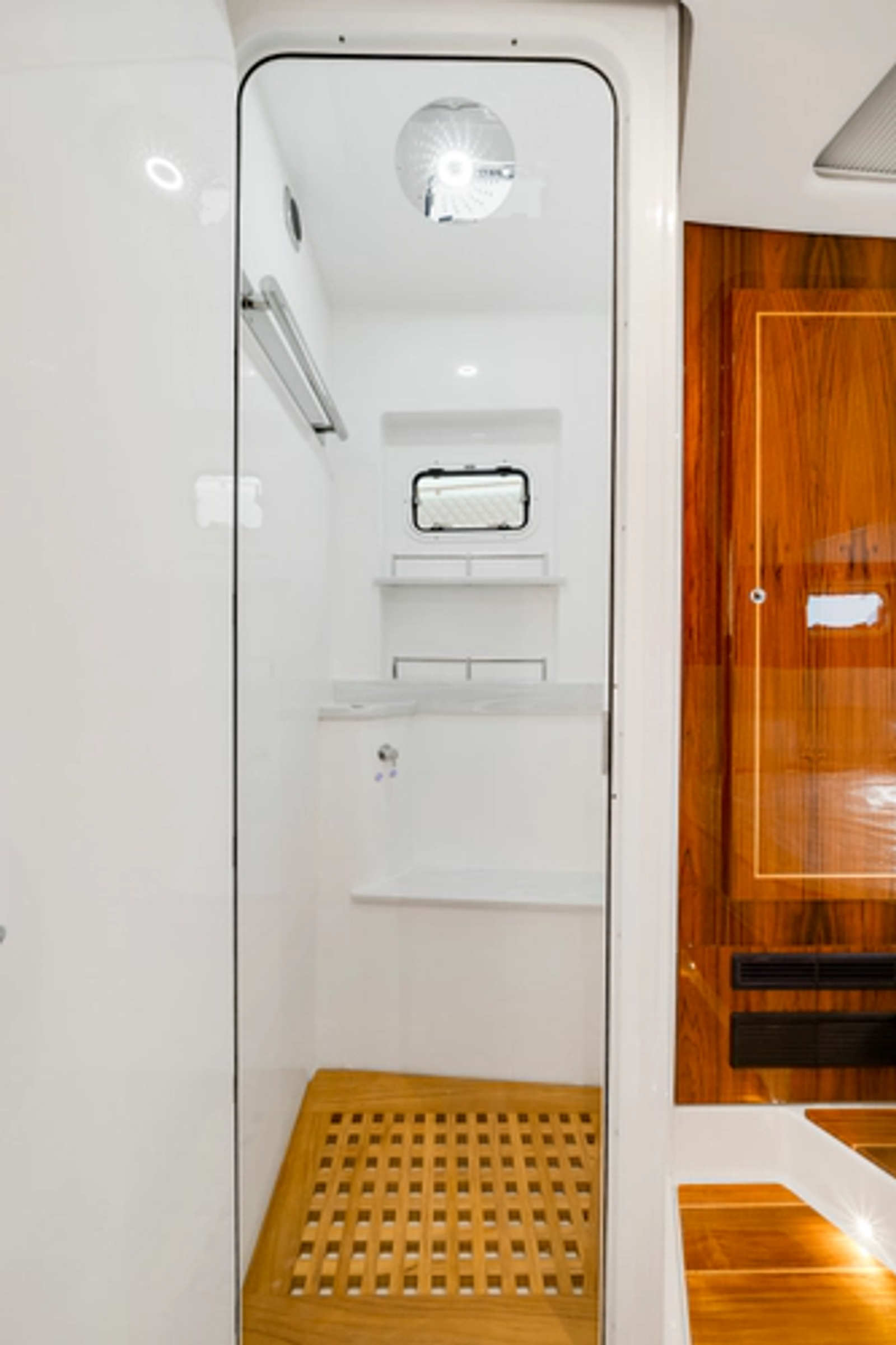 • Stainless steel steering wheel w/ high-gloss teak rim & power knob