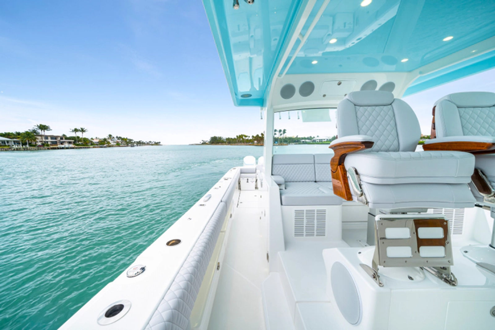 • Release Marine triple helm seats w/ teak ladder backs