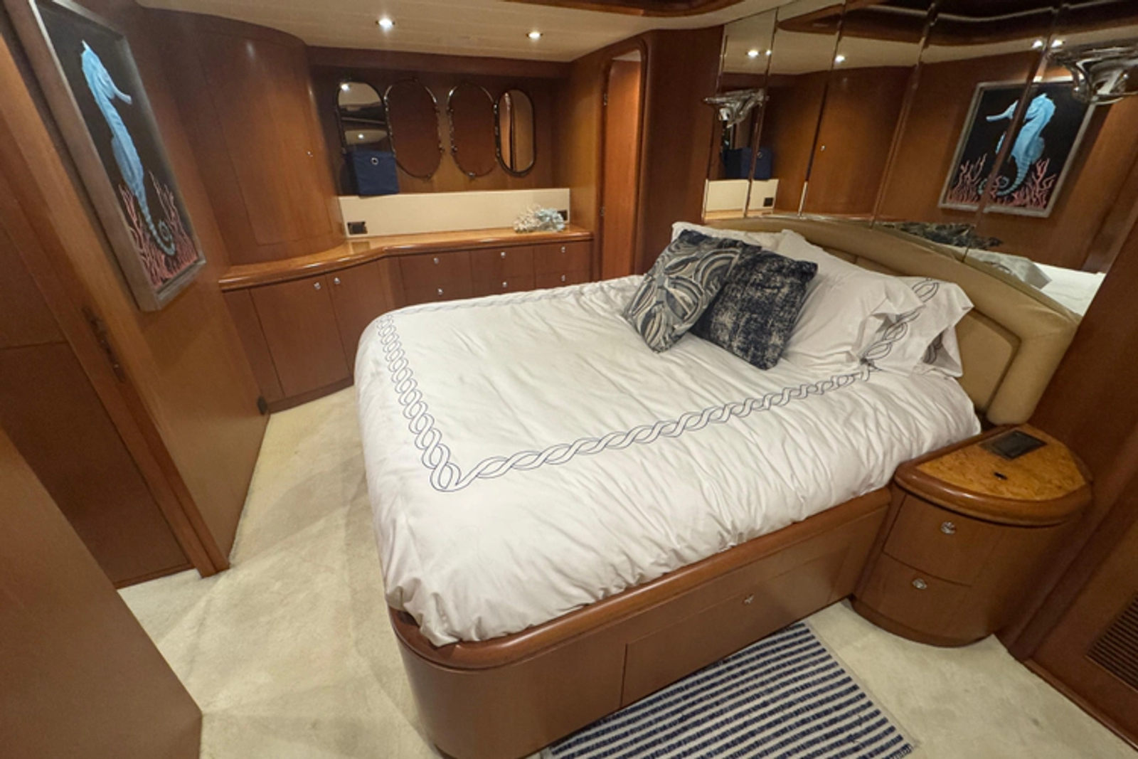 The large upholstered headboard sits upon a high panel mirrored bulkhead with two sconce lights. Above the berth is a raised tray-type ceiling with rope lighting, high gloss trim, and smoked mirrors.