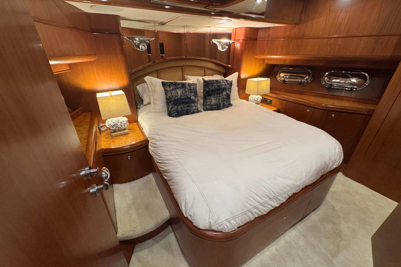 To port is additional cabinetry and several drawers. The portholes in the master are customer-enlarged vertical ovals with stainless steel weather covers. Also in the master stateroom are several overhead halogen mini spots, two overhead stereo speakers, a smoke detector, digital Marine Air A/C controls, and accent rope lighting.