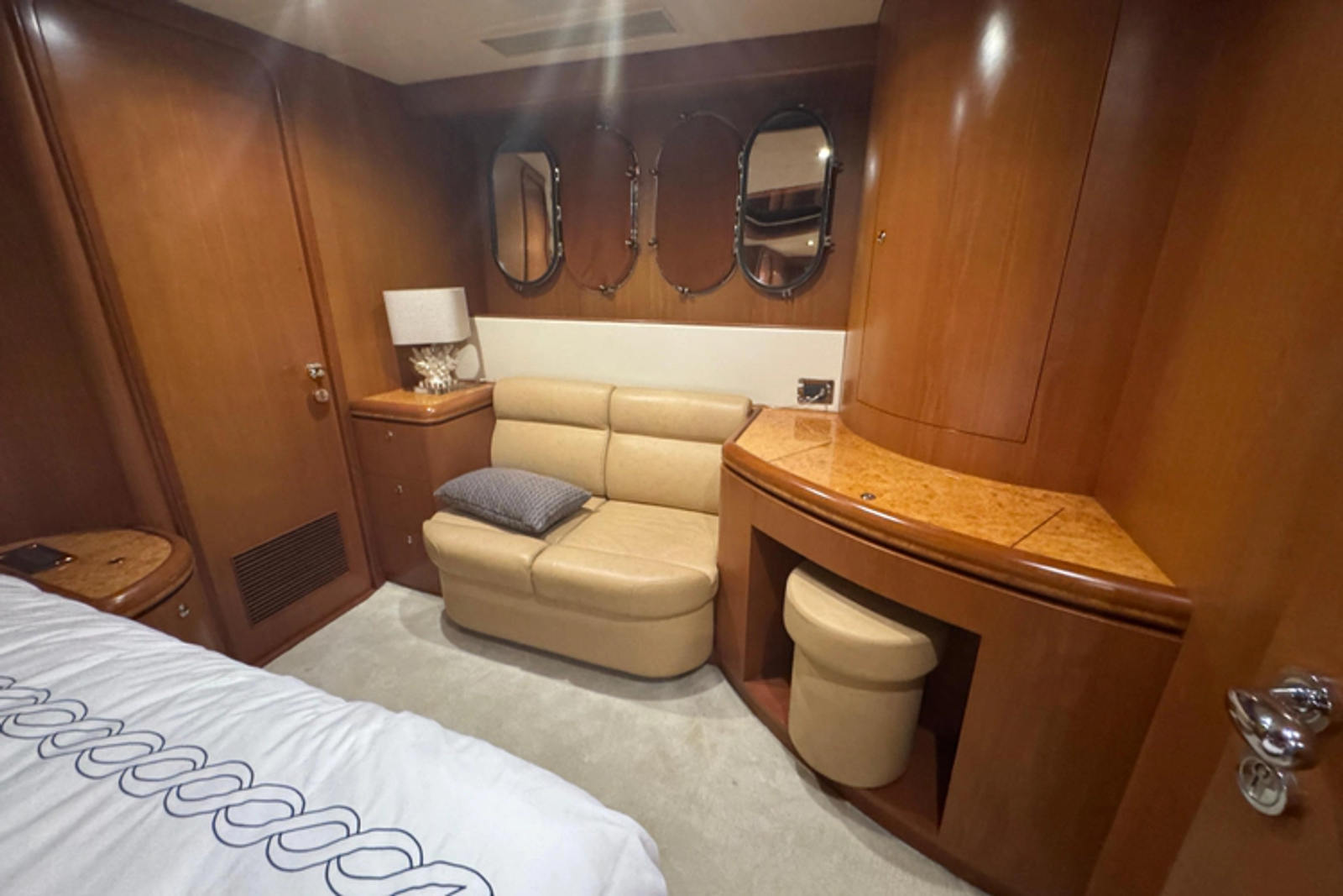 To starboard starting aft is a walk-in locker with a safe, a cabinet with an AM/FM/ DVD system, and a satellite receiver. Next forward is a two-person settee with storage below. Furthest forward is a vanity and additional storage lockers above. Also in this stateroom is a Samsung 21andquot; flat screen TV.