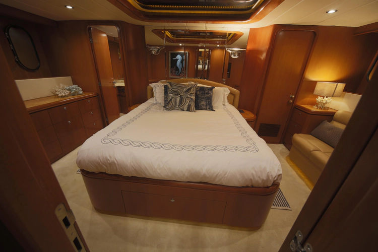 Located centerline of the yacht, this cabin offers maximized beam, a quiet and stable ride, and the highest level of fit and finish. Entering from the forward end, there is a king-size berth on the centerline with rope lighting and abundant storage below.