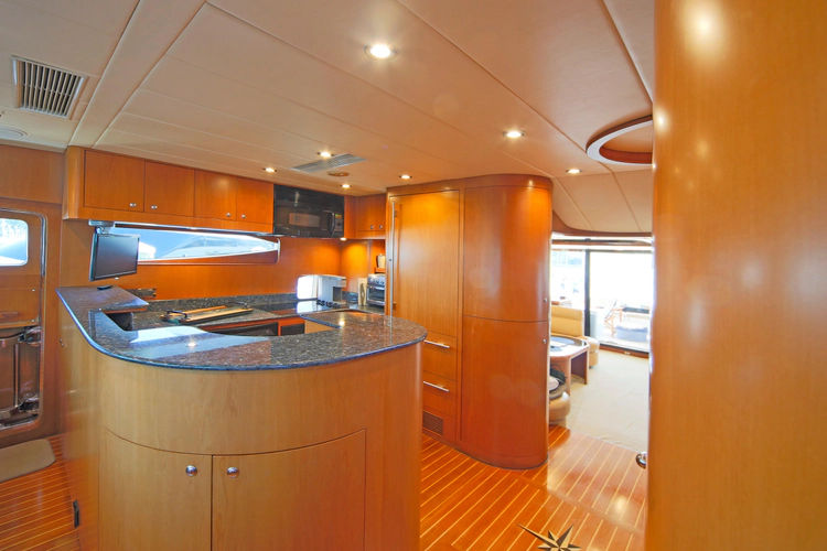 One step up and just forward of the salon is the open galley. The sole is teak and holly, countertops are granite. The galley is U-shaped off the starboard side of the yacht. There is a U-shaped dinette forward, with a country kitchen arrangement. ICOM VHF radio in the galley. Forward of the galley but open to the area is a small cherry table and a C-shaped settee to seat four.