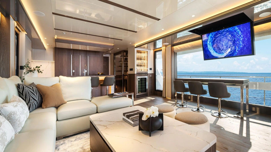 46. Skylounge 32” LED TV with SONOS Stereo (x1) and FUSION speakers (x2); OR, Open flybridge SONOS Stereo (x1) and FUSION speakers (x4).