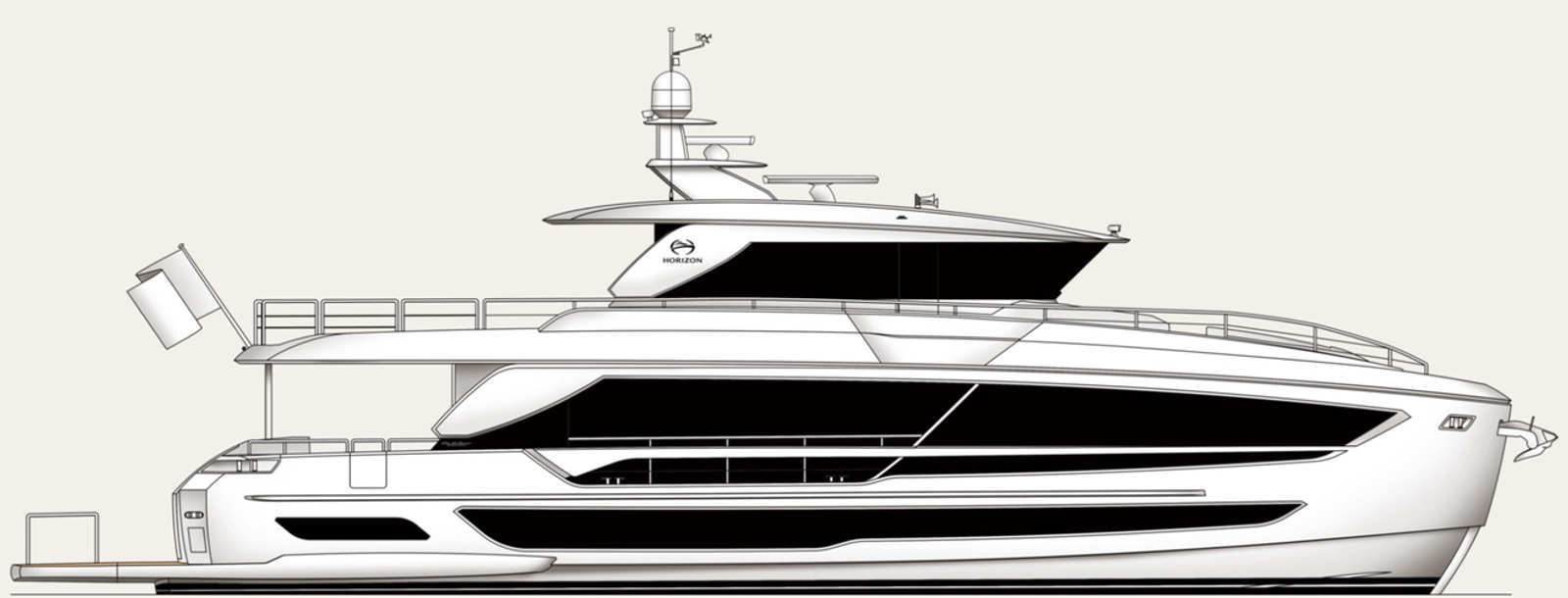- One piece hull and superstructure utilizing SCRIMPTM technology with Horizon patented 6D infusion, incl. longitudinal and transverse stingers.