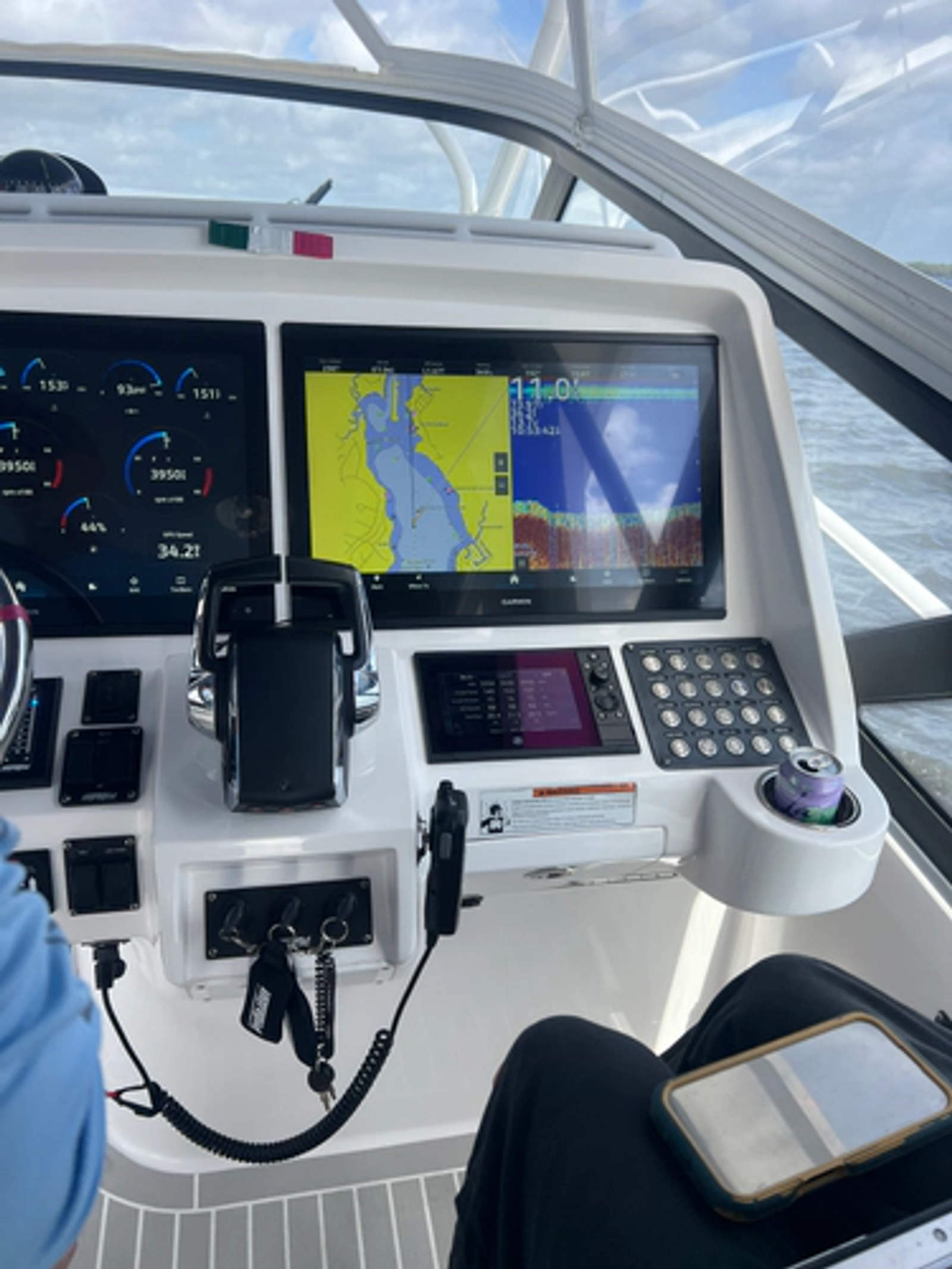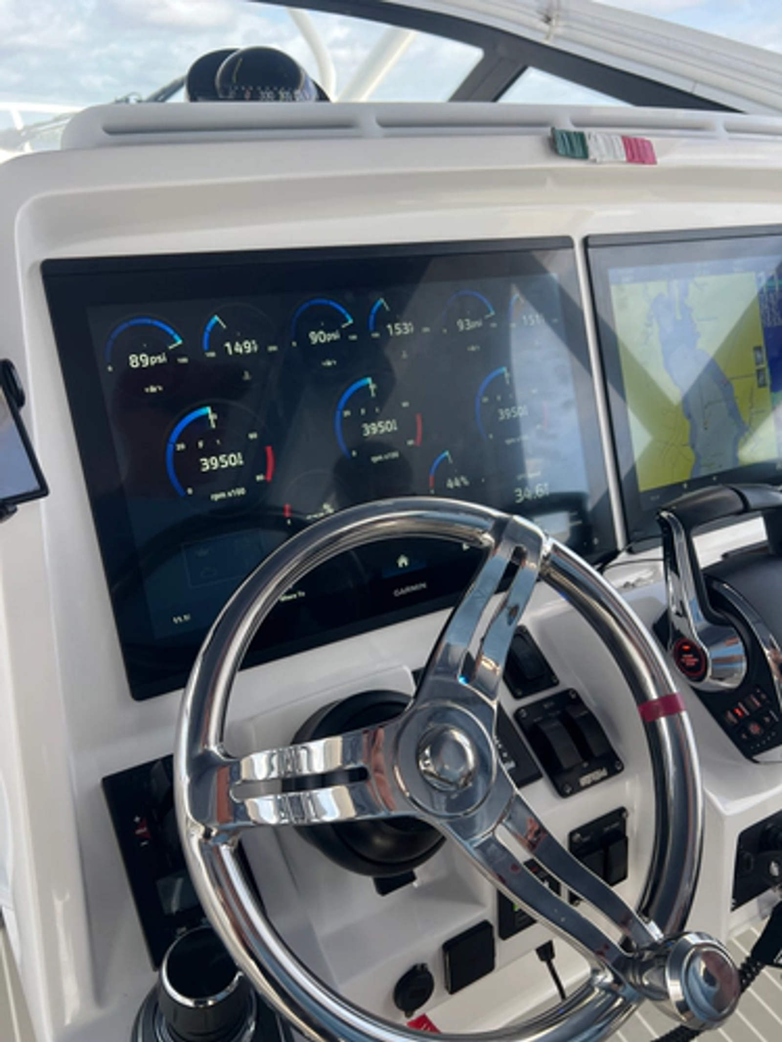 - Helm: Dual Garmin 24" displays, Garmin open array radar, and joystick piloting