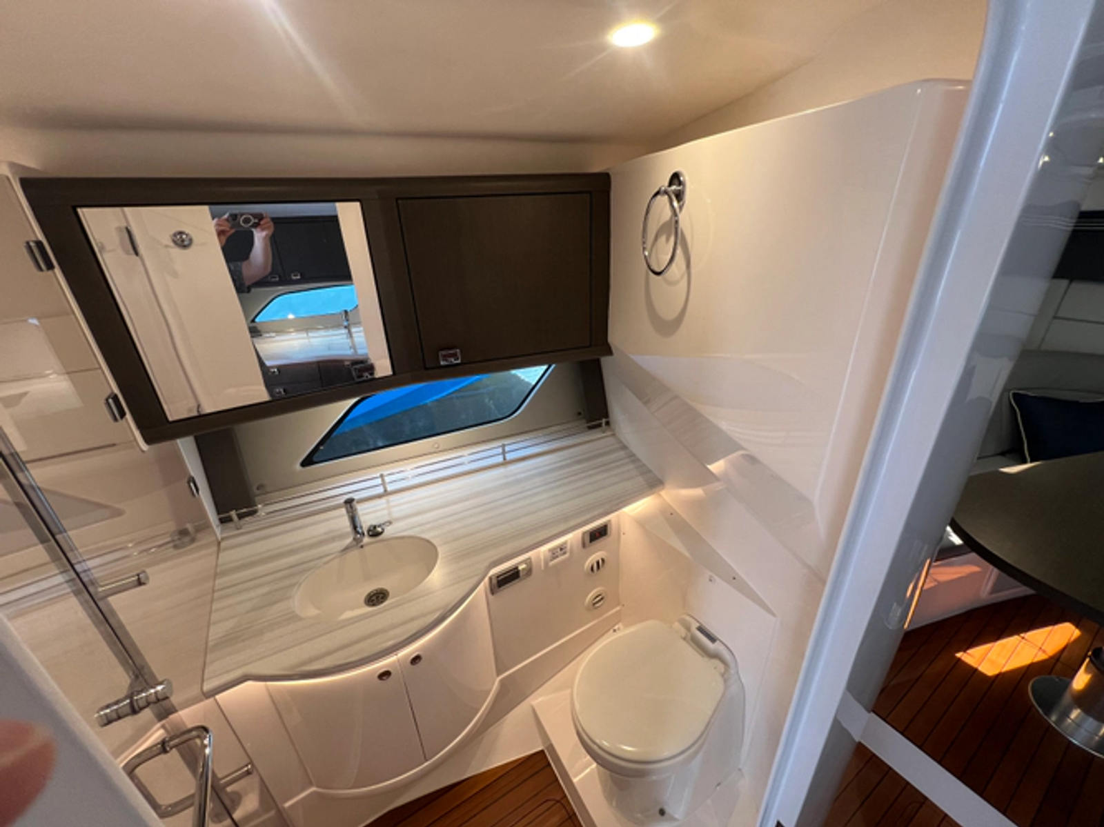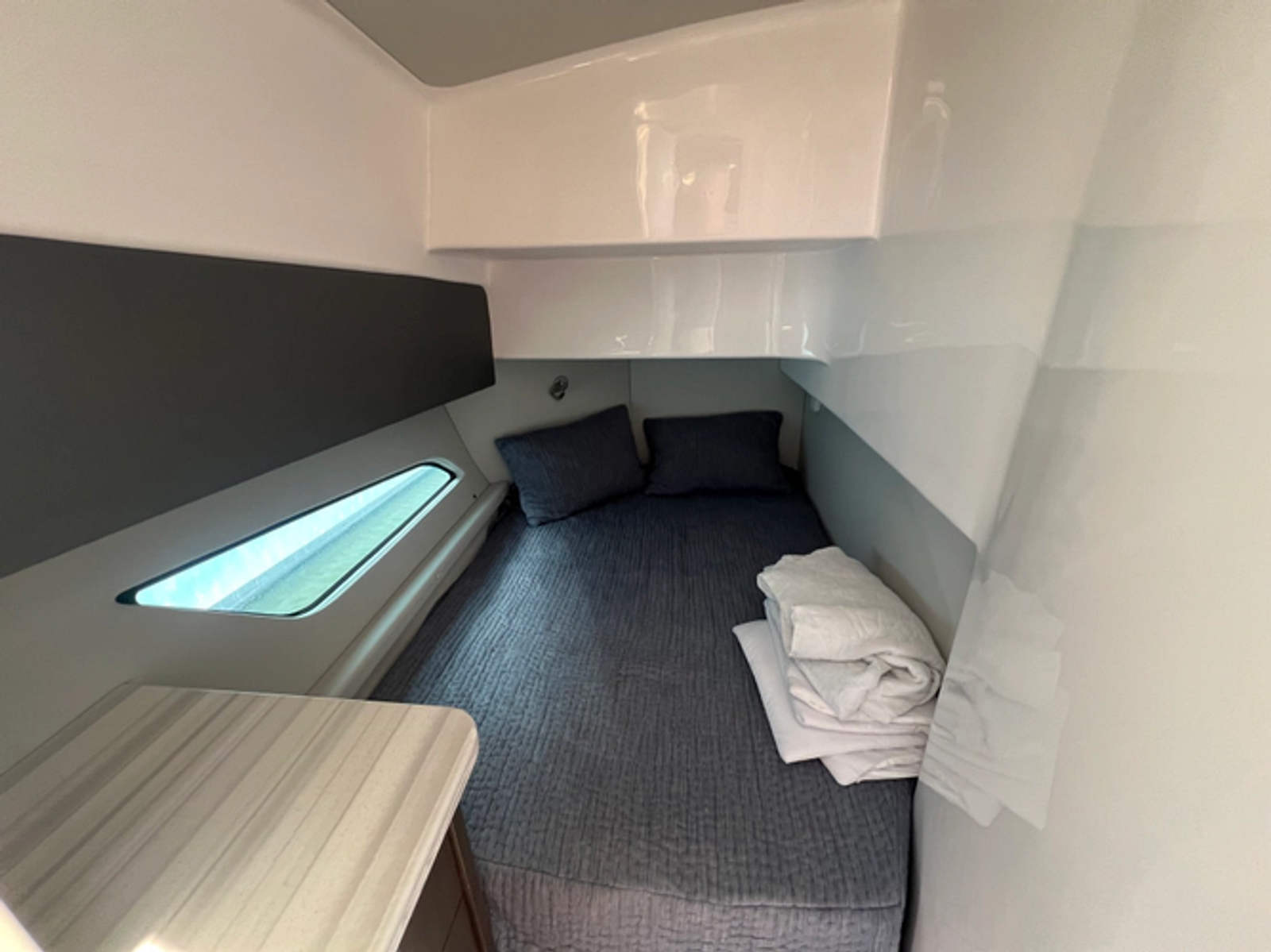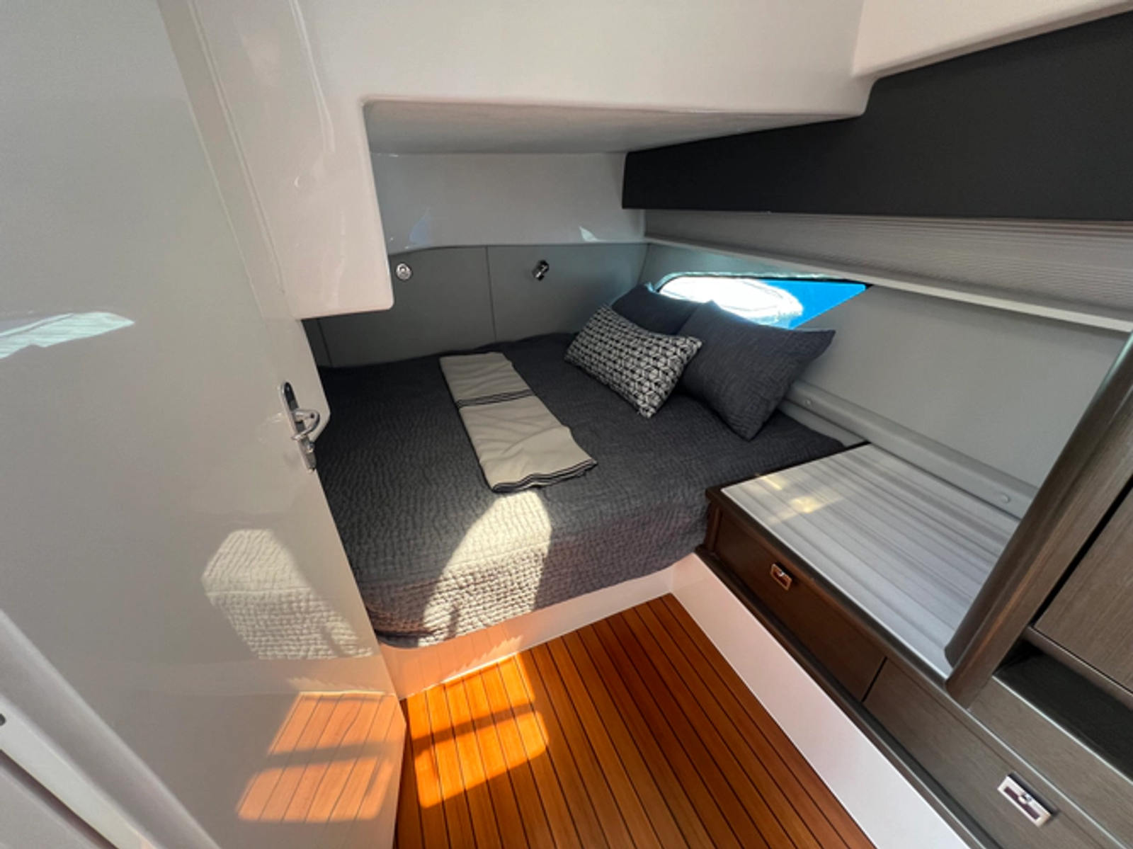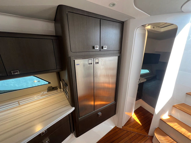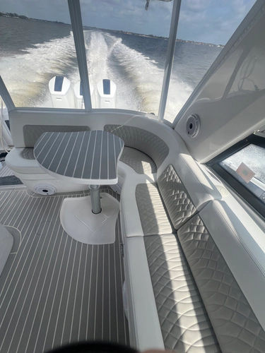 - Cockpit: Guttered, self-bailing cockpit with aft lounge, electric hi-low table, and optional shade system