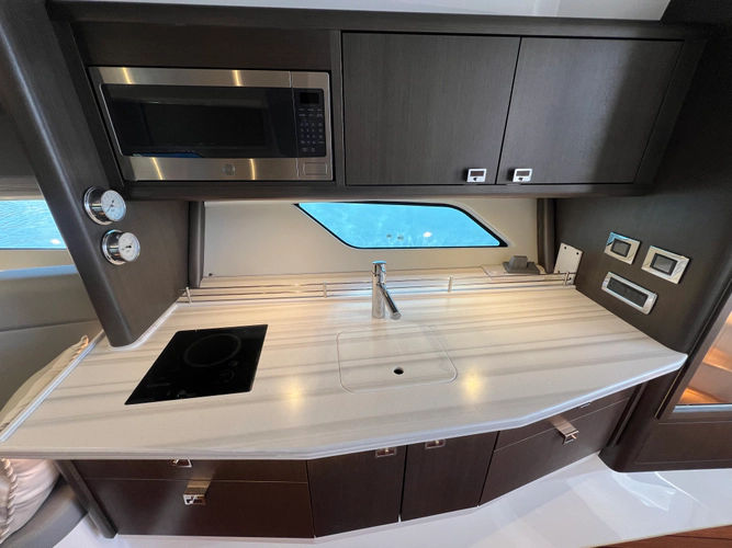 - Galley: Side-by-side refrigerator/freezer, microwave, and stovetop