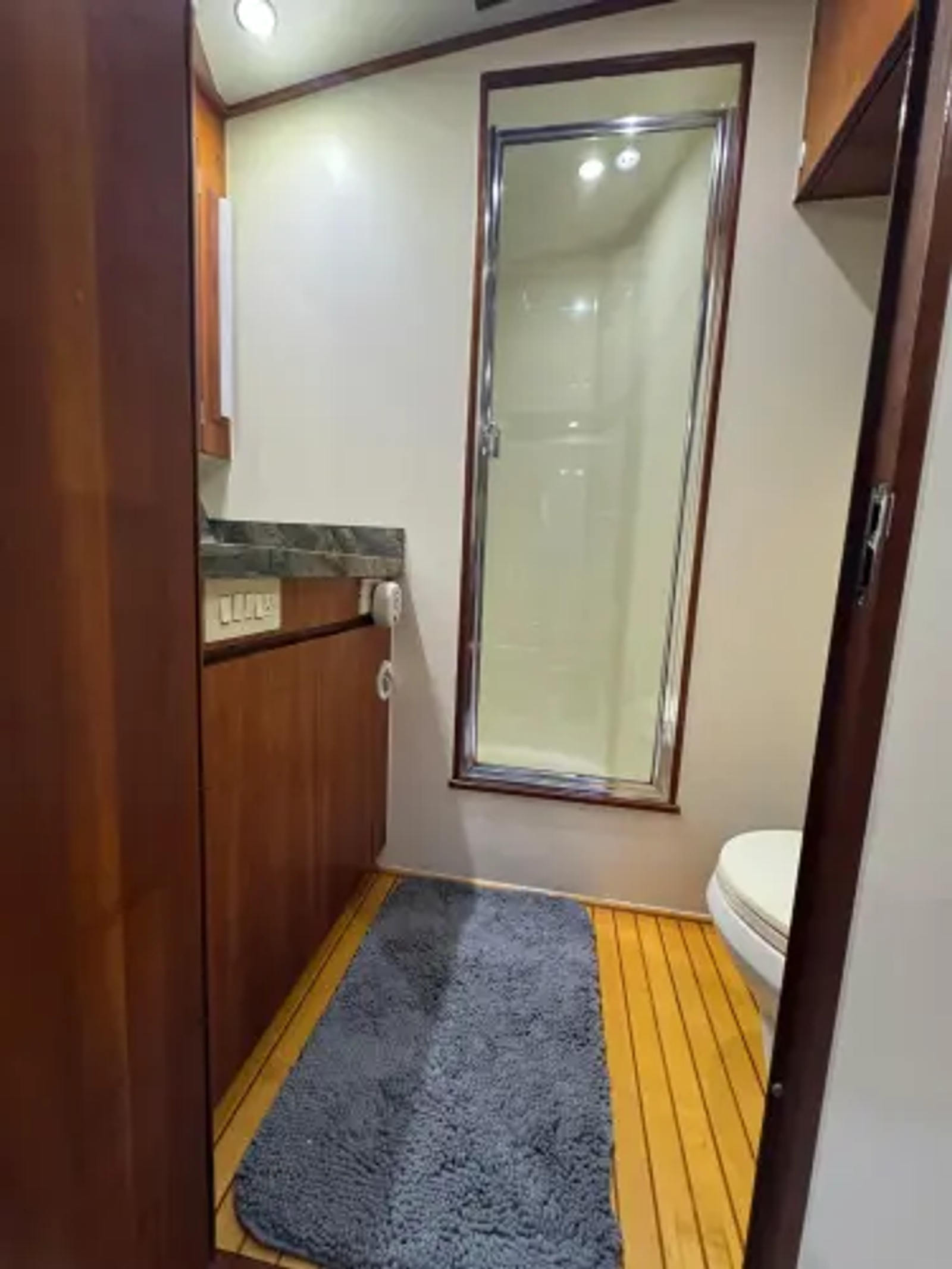 The starboard cabin is accessed from the guest companionway and comes with upper andamp; lower single bunks, carpeted floors, good storage in built-in lockers, and the head and stall shower is accessed aft. This head can also be accessed from the companionway.