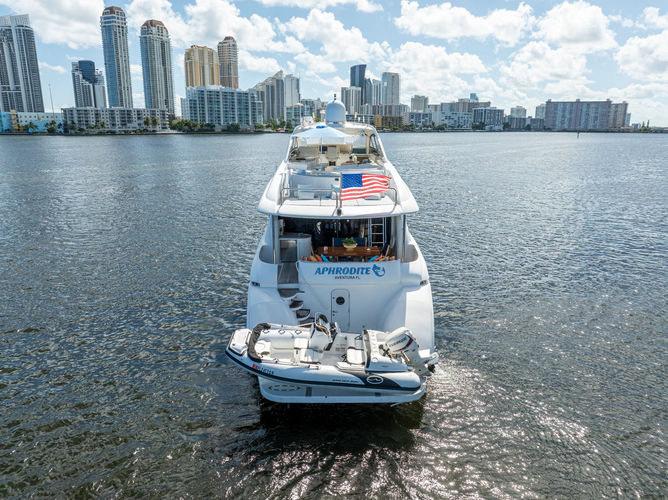 The 2004 Lazzara 80 is a luxurious motor yacht with a sleek design and an open flybridge, perfect for enjoying panoramic views. The flybridge features a helm station, seating, a wet bar, and even a jacuzzi for ultimate relaxation. Inside, the yacht offers elegant, modern finishes and spacious living areas. With its large aft deck and smooth cruising capabilities, it's designed for both comfort and style on extended trips.