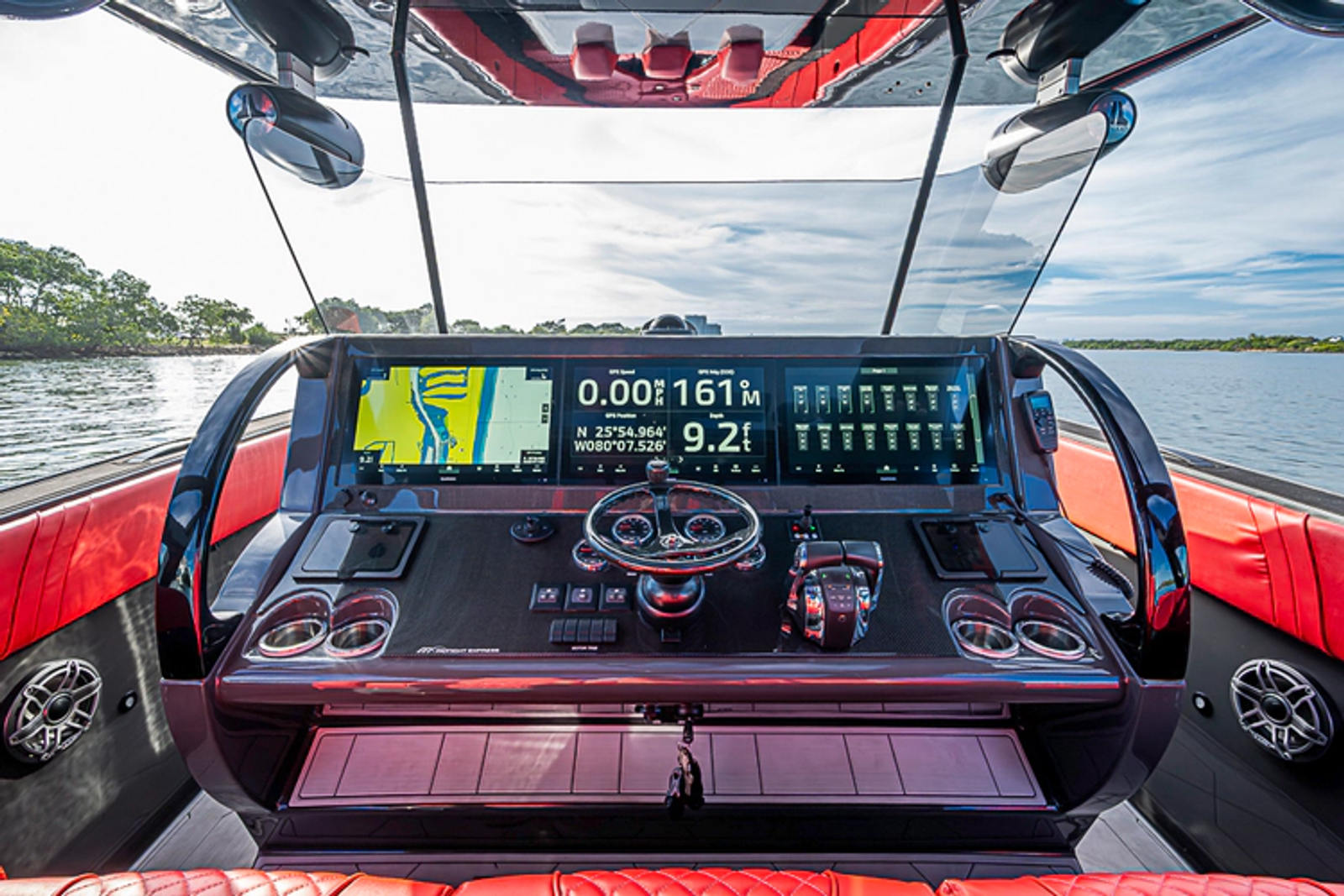 The helm is a captain’s dream, featuring three Garmin 8622 GPS displays, a FLIR night-vision camera, and a rear cockpit camera for enhanced visibility and safety day or night. For peace of mind on and off the dock, the Siren 3 security system keeps you connected to your vessel at all times.