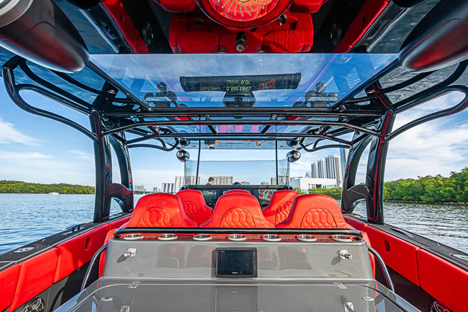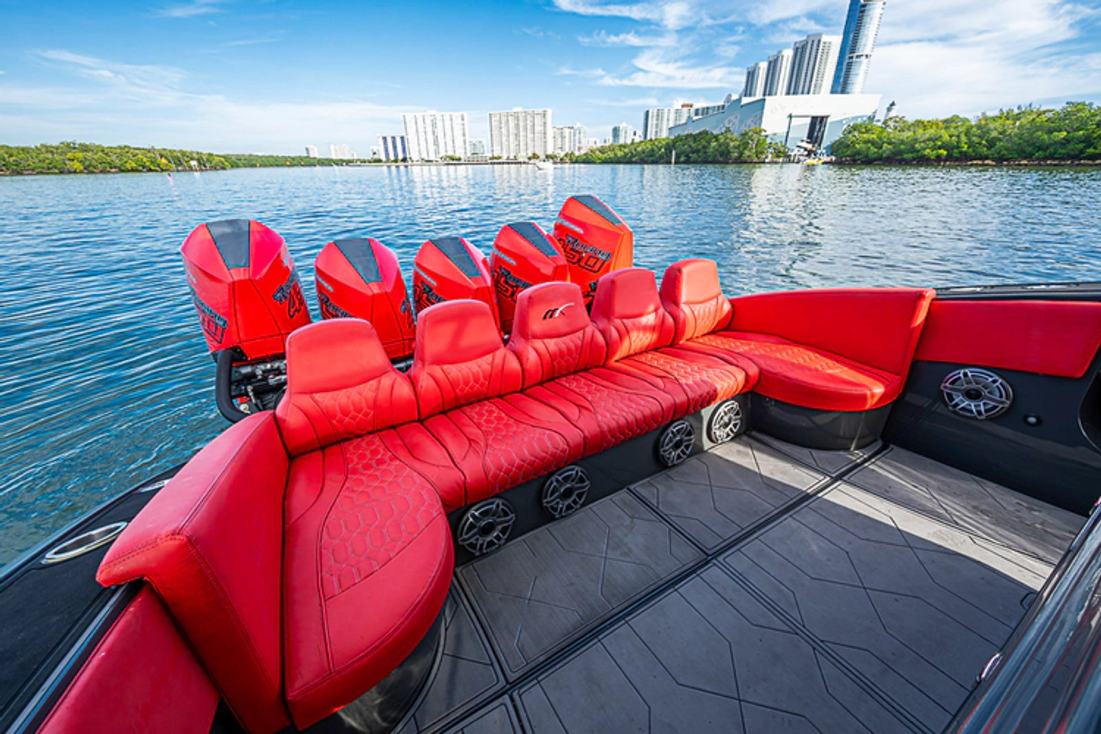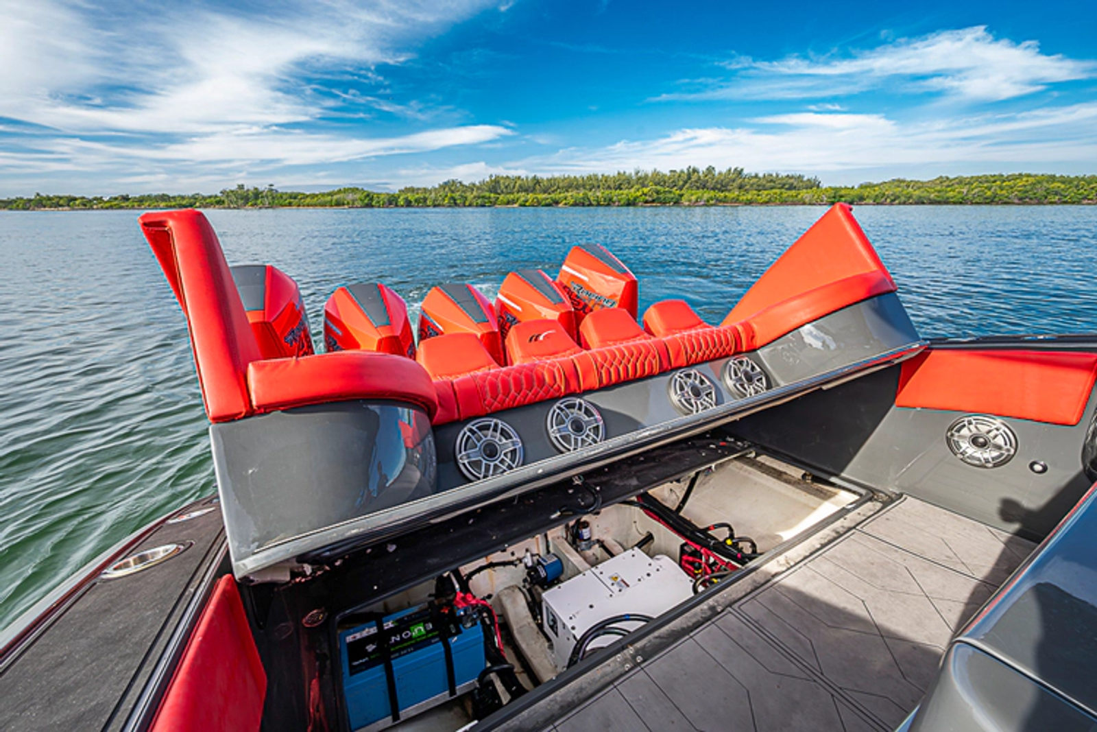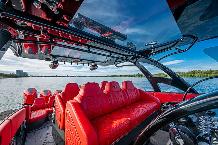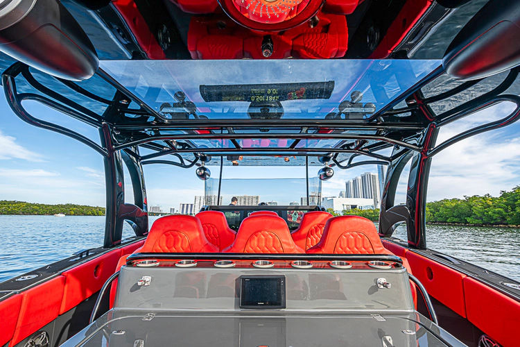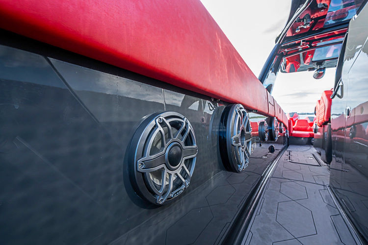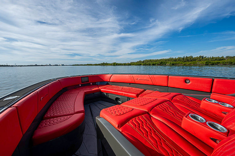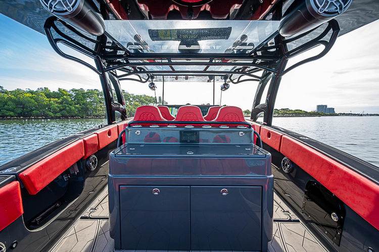 As evening falls, the boat truly comes alive. Spectrum LED underwater lights illuminate the water in stunning color, while the premium JL Audio sound system delivers concert-quality sound throughout the cockpit—perfect for entertaining in style.