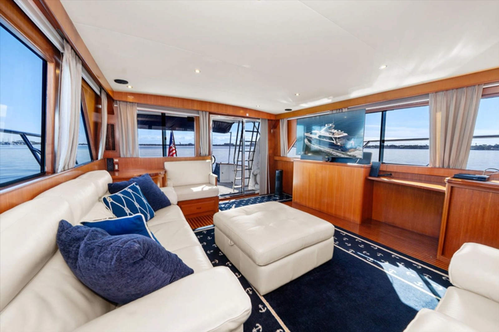 The salon features a new leather recliner sofa, chair and ottoman, new 60andquot; Samsung TV, Satellite DirectTV, Sony DVD player, Yamaha stereo system throughout the boat, anchor blue carpeting, salon table, work desk, entertainment cabinet, and a large general-purpose cabinet forward and to stern.