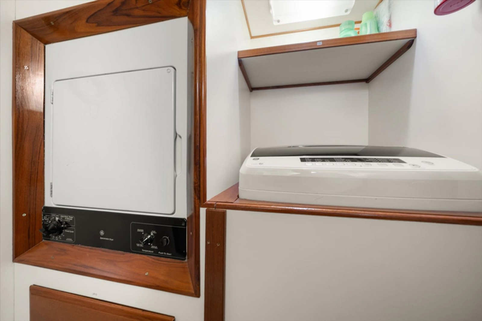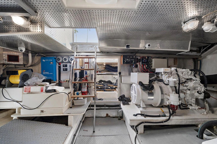 She is a three-stateroom boat with an expansive master stateroom amidship. The Master stateroom amidship features a walk-around king berth w/ new custom mattress, linens, pillows, and UV Breathe Easy filters on the HVAC. (4) large hanging lockers, 8-drawer dresser, ensuite head with marble countertops and large stall shower, (2) nightstands, portlights, and LED lighting.Just aft of the master and forward of the engine room is a separate work/laundry room with a workbench, sink, storage, and separate new washer andamp; dryer. Further aft is the large and easy-to-navigate engine room, which can also be accessed from the lazarette.