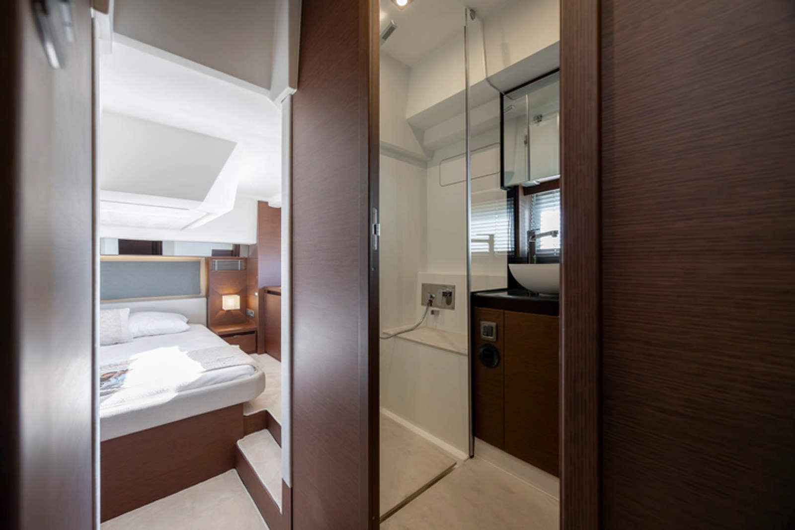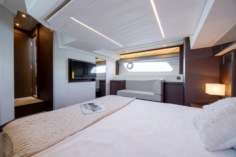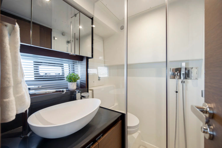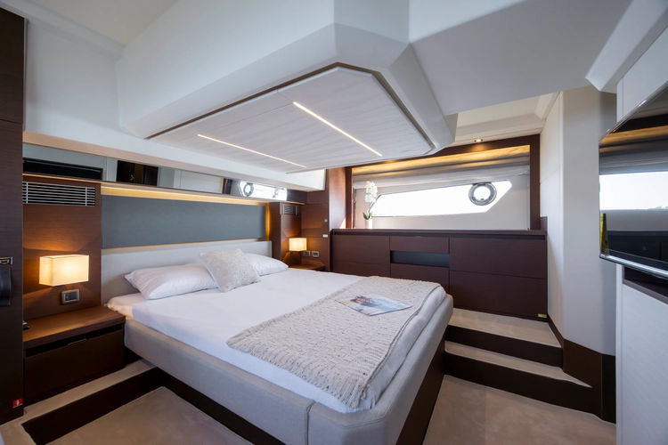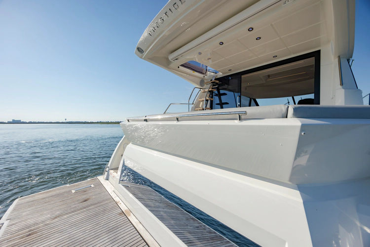 On the exterior, she features the signature style of the latest PRESTIGE Yachts, with an expanded, continuous line of windows in the hull. This Flybridge integrates the concept of the L-shaped cockpit, which allows for maximum use of space. Transformable into a very large aft sundeck, this cockpit can also house a fully equipped skipper cabin.