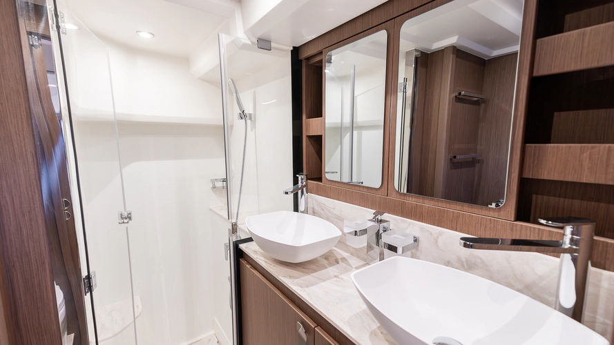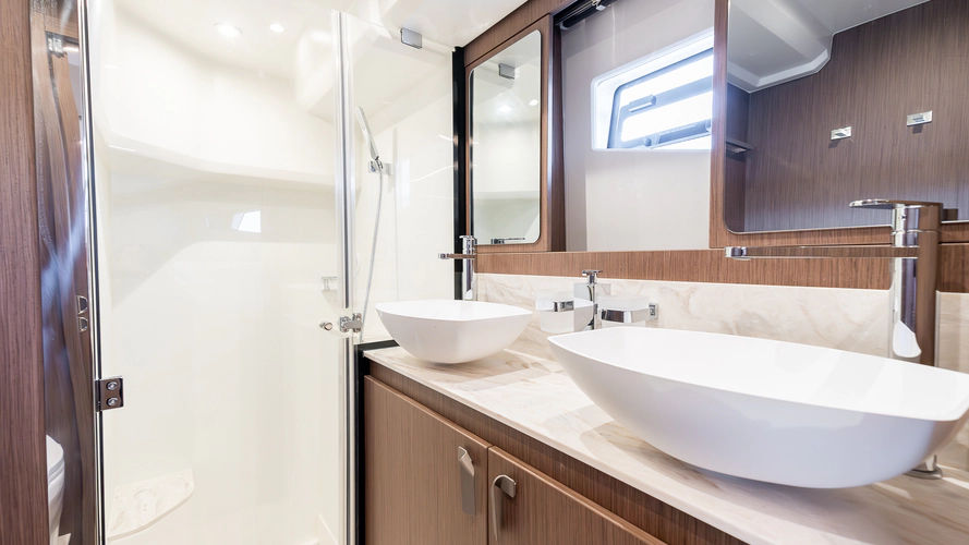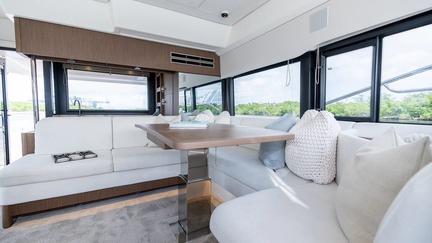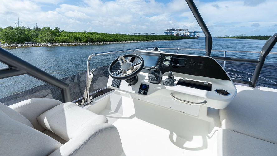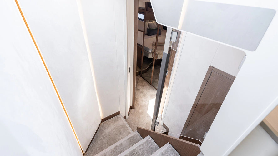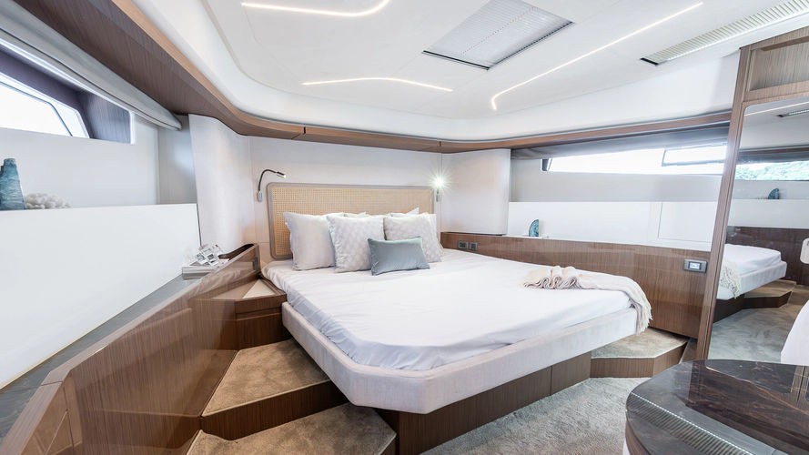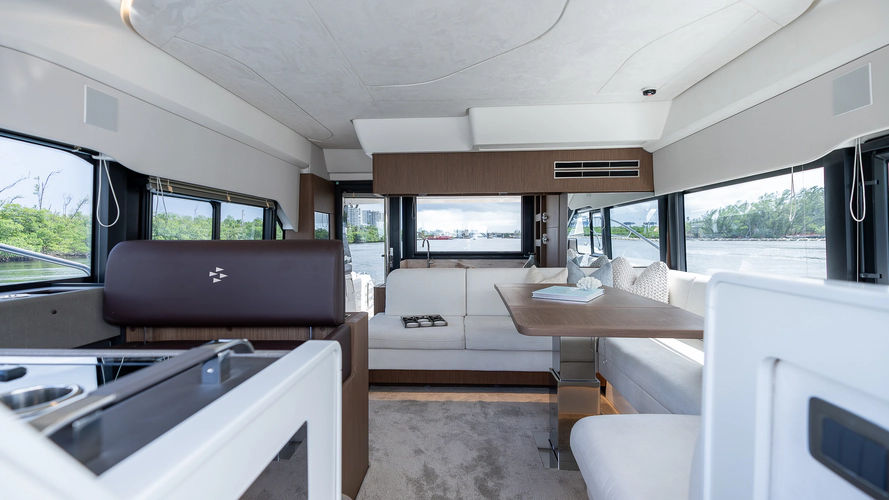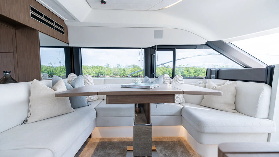 Inspired by the movement of water, the elegant, fluid exterior lines of the new hull of the F4.9 marry perfectly with the polished surfaces of living spaces, reflecting an abundance of natural light. Curves have been meticulously studied to confer softness, refinement, and power to the whole. The exterior and interior furnishings have been reinvented to offer exceptional comfort for all on board.