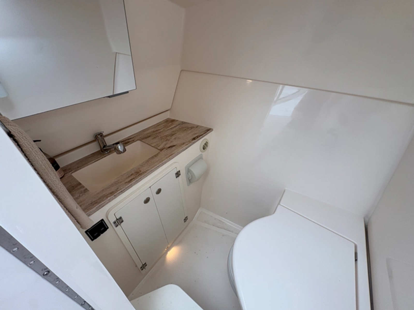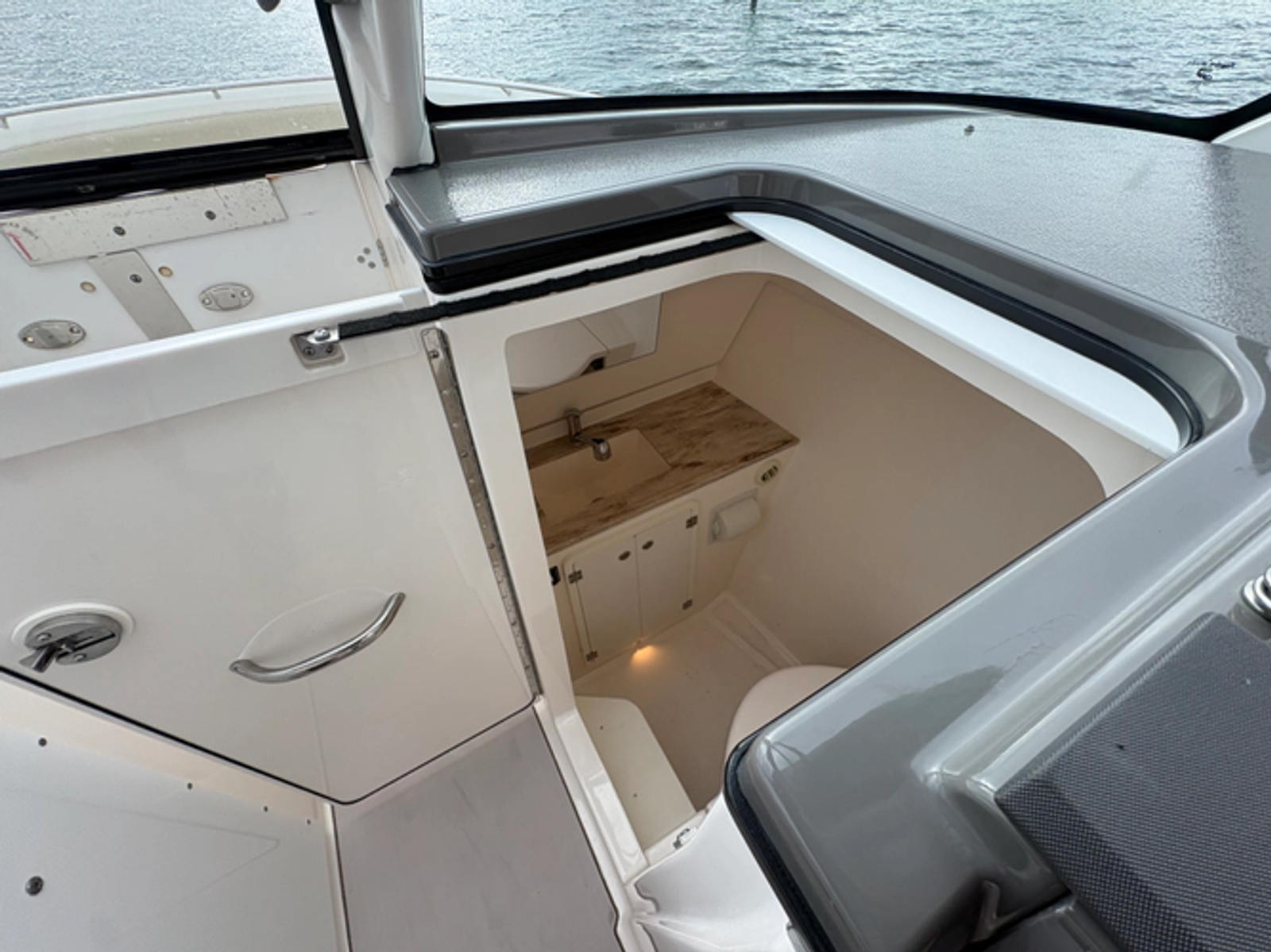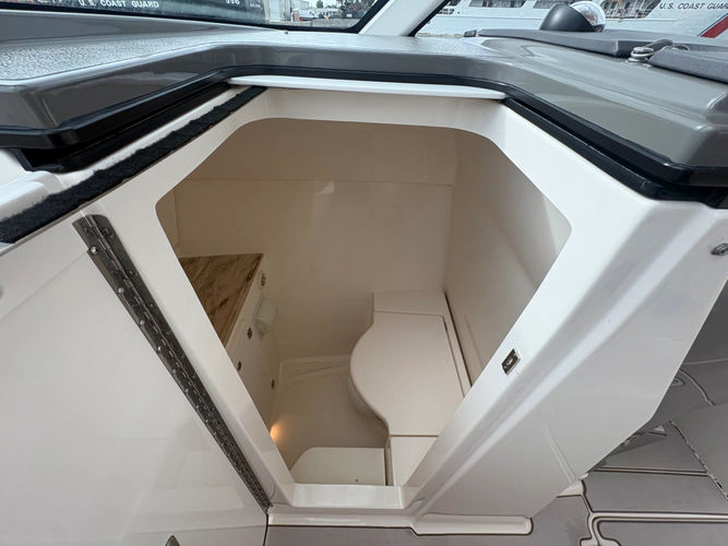 Both consoles open to useful interior spaces, including dedicated equipment storage on the port side and a fully enclosed head on the starboard side with an innovative dual-action door system.