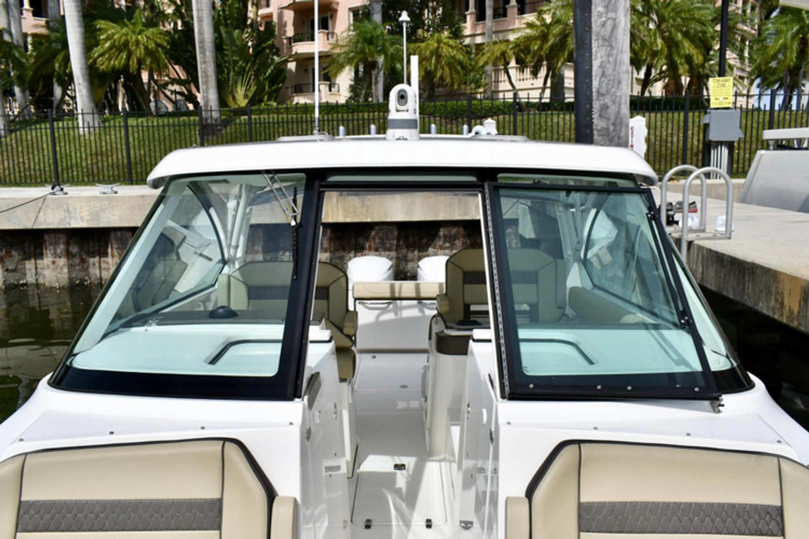 The DC 325 dual console combines central utility, a starboard side helm center and tremendous seating functionality into an elegantly styled boat. The DC 325 features an open bow design with full wrap-around seating and plenty of storage. The fully integrated fiberglass hardtop with visor is engineered with a tempered glass windshield system, composite frame forward and bonded to the fiberglass hardtop. Port and starboard glass is fixed in a white, powder-coated aluminum frame complete with recessed enclosure track. The port side wrap-around lounge, double-wide helm seat, cockpit seating and forward bow seating offer plenty of available spaces to satisfy everyone’s favorite spots to ride along or run the DC 325.