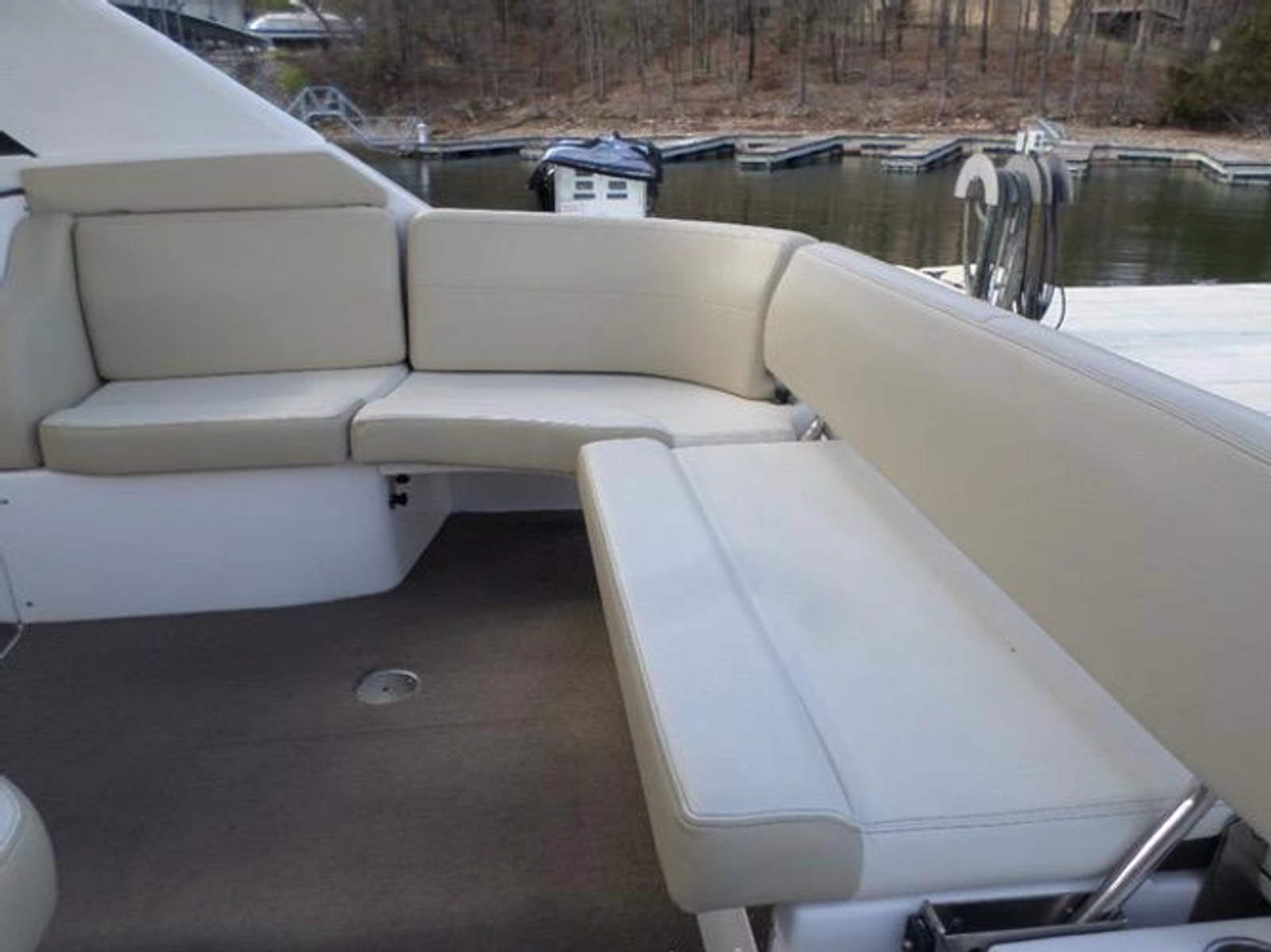 The foredeck is accessible by way of the easily maneuverable side decks and through a convenient walk-through panel in the middle of the windshield. The foredeck is particularly recessed and flat and girded by a waist-high railing. Three deep storage compartments are below the deck.
