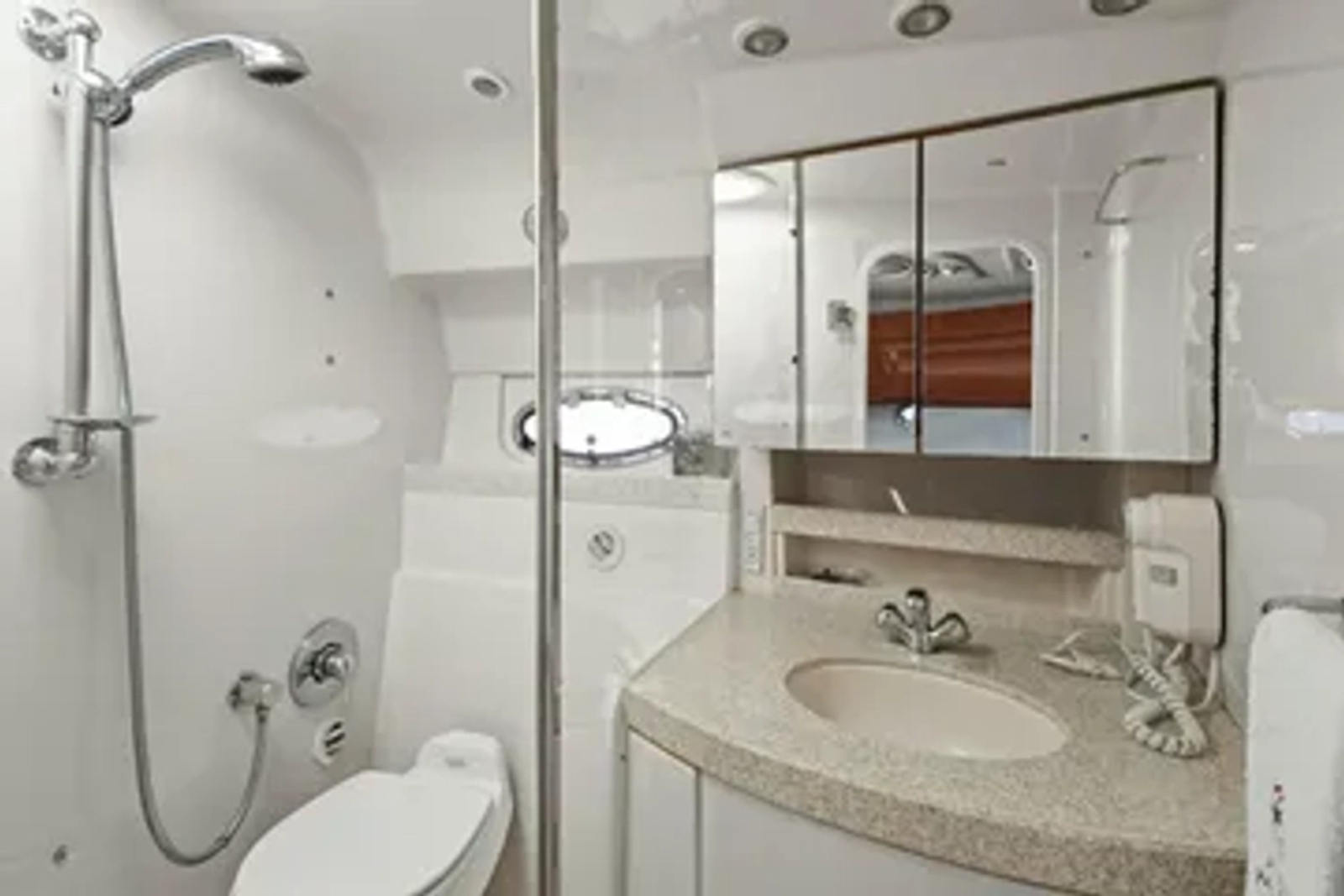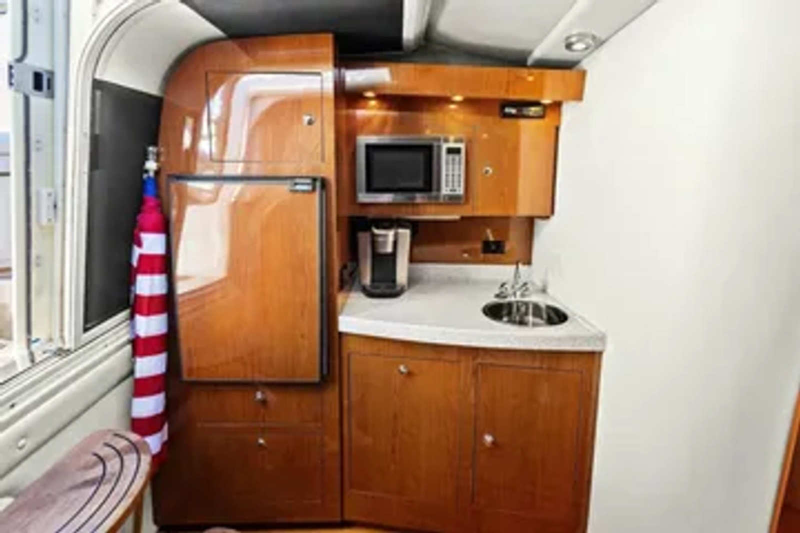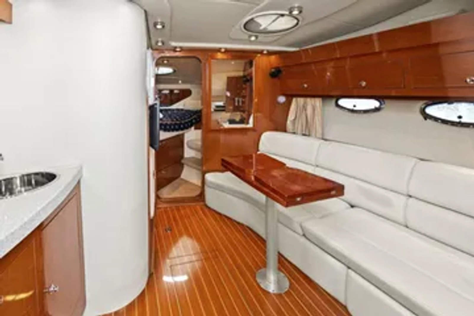 In a market filled with midsize family cruisers, the Regal 3560 Commodore stands out for its unrivaled blend of luxury, performance and craftsmanship. Step inside this magnificent vessel, where a spacious interior features high-gloss cherry wood cabinetry, elegant Corian countertops, and supple leather upholstery—offering the kind of comfort and sophistication you'd expect from the finest American sport yachts. The forward stateroom is thoughtfully separated by a solid wood pocket door for added privacy, while the open-concept salon effortlessly flows into the midcabin, creating a spacious and inviting area perfect for entertaining.