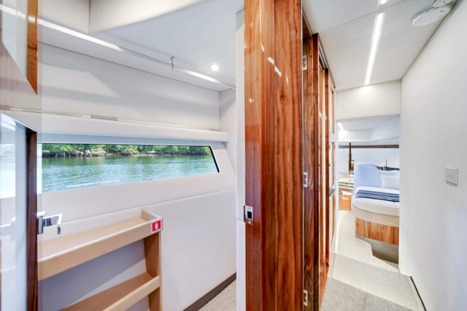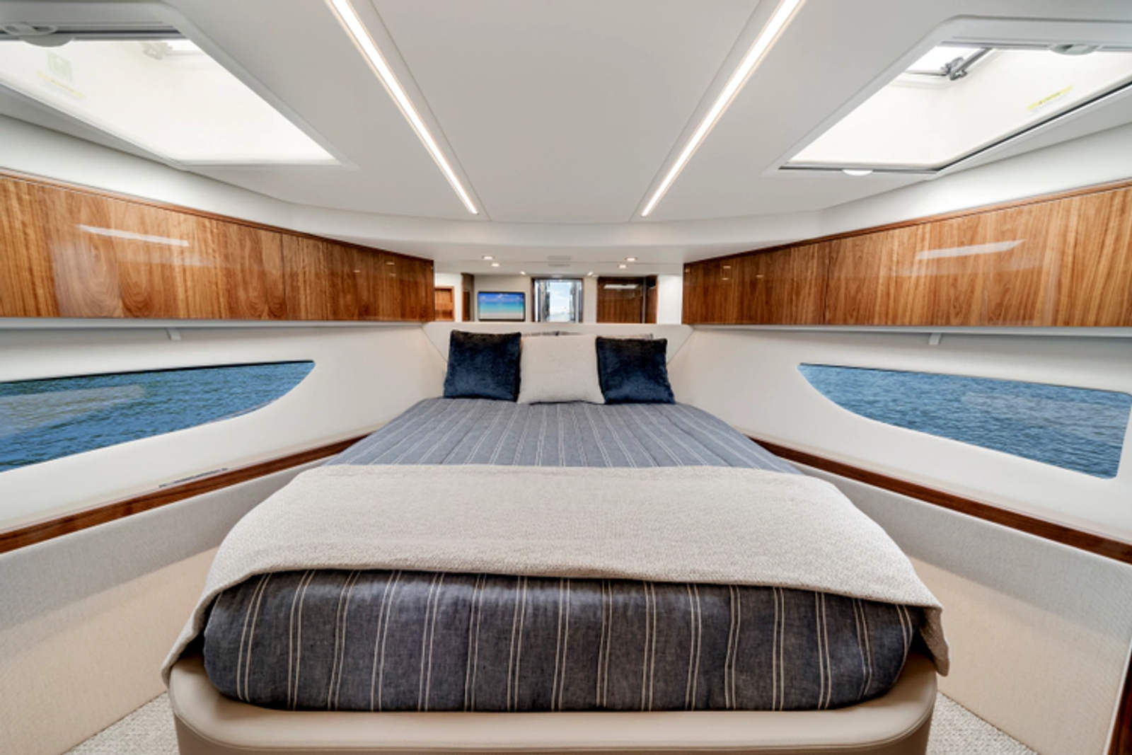 Designed by 4D Designs in collaboration with the Riviera design team and built in-house to our exacting standards on Australia’s Gold Coast, the new 50 Sports Motor Yacht is a remarkable package. Offering all of the essentials you’d expect to find on a much larger yacht, including foredeck relaxation zone, walk-around side decks, all-weather alfresco mezzanine entertaining, spacious luxurious saloon with internal staircase to an enclosed air-conditioned flybridge and state-of-the-art helm. The generous three cabin/two-bathroom accommodation deck is bathed in natural light from tinted glass hull windows and features a magnificent full-beam master stateroom.
