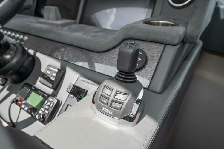Ergonomically designed console with drink holders, storage tray, electronic engine controls and joystick docking control