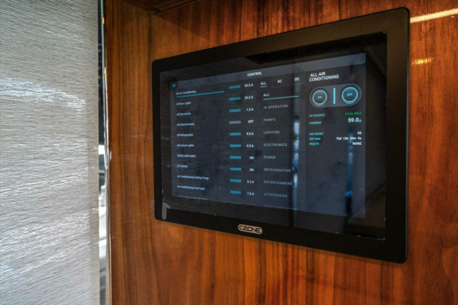 Digital monitoring system including ACandamp; DC power metering, fluid tank level monitoring andamp; DC circuit status via 10and#39;and#39; colour LCD touch screen mounted at aft saloon and 5and#39;and#39; Touch control screen at helm