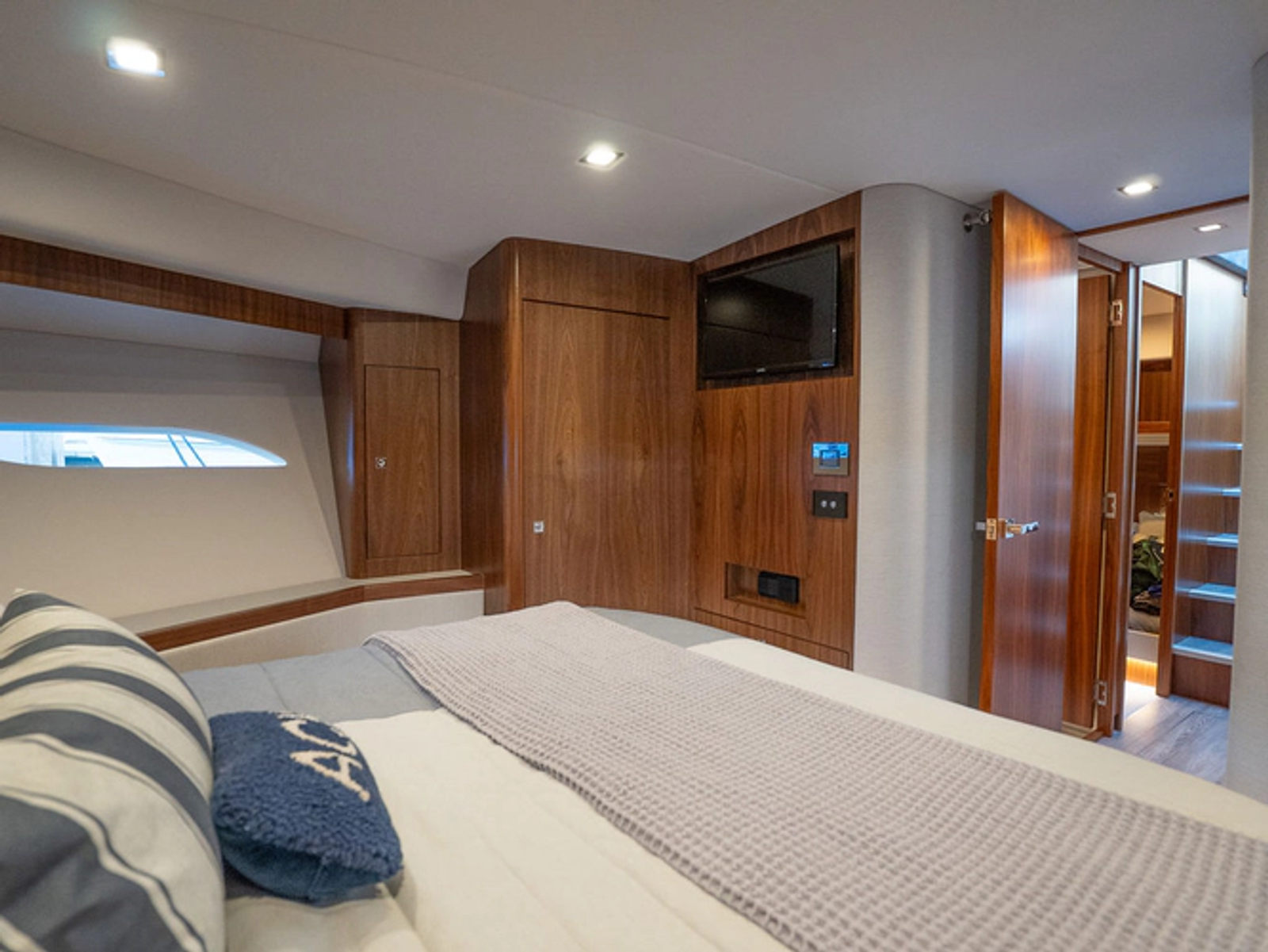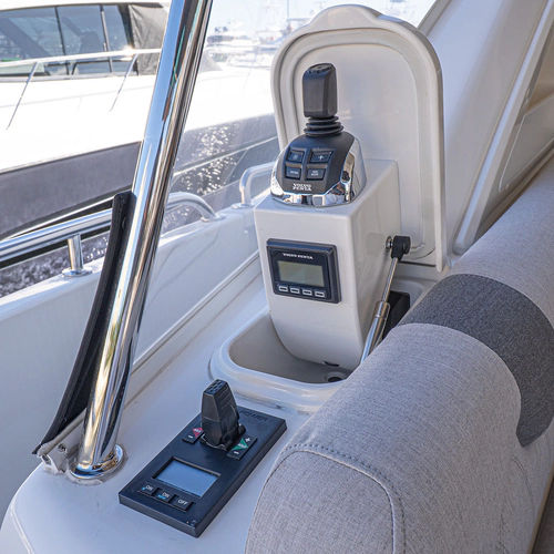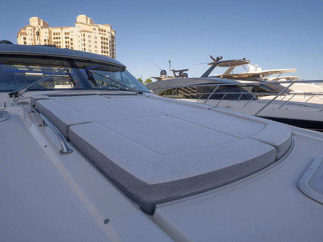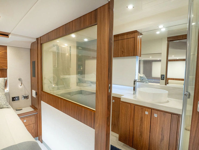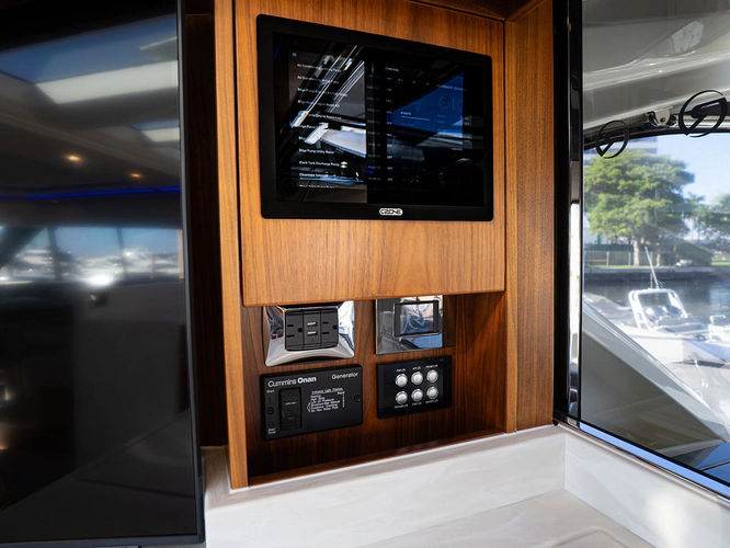 Equipped as follows: Upper Galley Three Stateroom layout, Crew Cabin Brigg Tender with Honda O/B. Gloss Walnut Gloss interior, Upholstery Convertible Dinette table, Upgrade Generator, Seakeeper 9 Gyro , KVH 7 with second dome, Targa uplighting, Underwater lighting 4 transom-2 Sea Blaze blue /white, FLIR thermal camera M232, AIS 800 Transceiver, Water Maker Blue Water legend 950, Awning camera, Anchor camera, Engine Room Camera, Tropical AC, Rear Lounge Cockpit, Hi Lo Cockpit table, Wine Cooler, Port and Starboard entry doors, Garmin Radar GRM Fathom chirp, 2x17" Volvo Glass bridge screens 8617 inc GPS & grid, Sounder Transducer CHIRP Garmin GSD 26 with sounder , Auto Pilot integrated into Glass bridge, Foredeck Lighting (6) each side Hella easy fit blue, Reinforced Transom cleats, 2 Garmin GC200 under Targa wing port & stbd, Dock Boost system 2x DBT 15's, Starboard side wet bar Platinum painted in place of standard lounge,2 Cockpit docking stations with Joy Stick Controls, Bow Thruster, Solid Surface Bench Tops, Galley ware package, Bath ware Package, Mattress protectors for all cabins including Crew Cabin, Double interior power points with USB, Upholstery Upgrade to all interior fabrics, Bed side Inlays, Salon and Galley stairs to include lower landing area fllors, Salon Roller blinds white sheer, Master Stateroom white blackout, Additional fitted sheets to master, Additional fitted sheet to lower lounge, Mattress protectors, Upgraded 100% Wool Carpets Stateroom, Upgrade to Sunbrella in Cockpit and Forward sun lounge