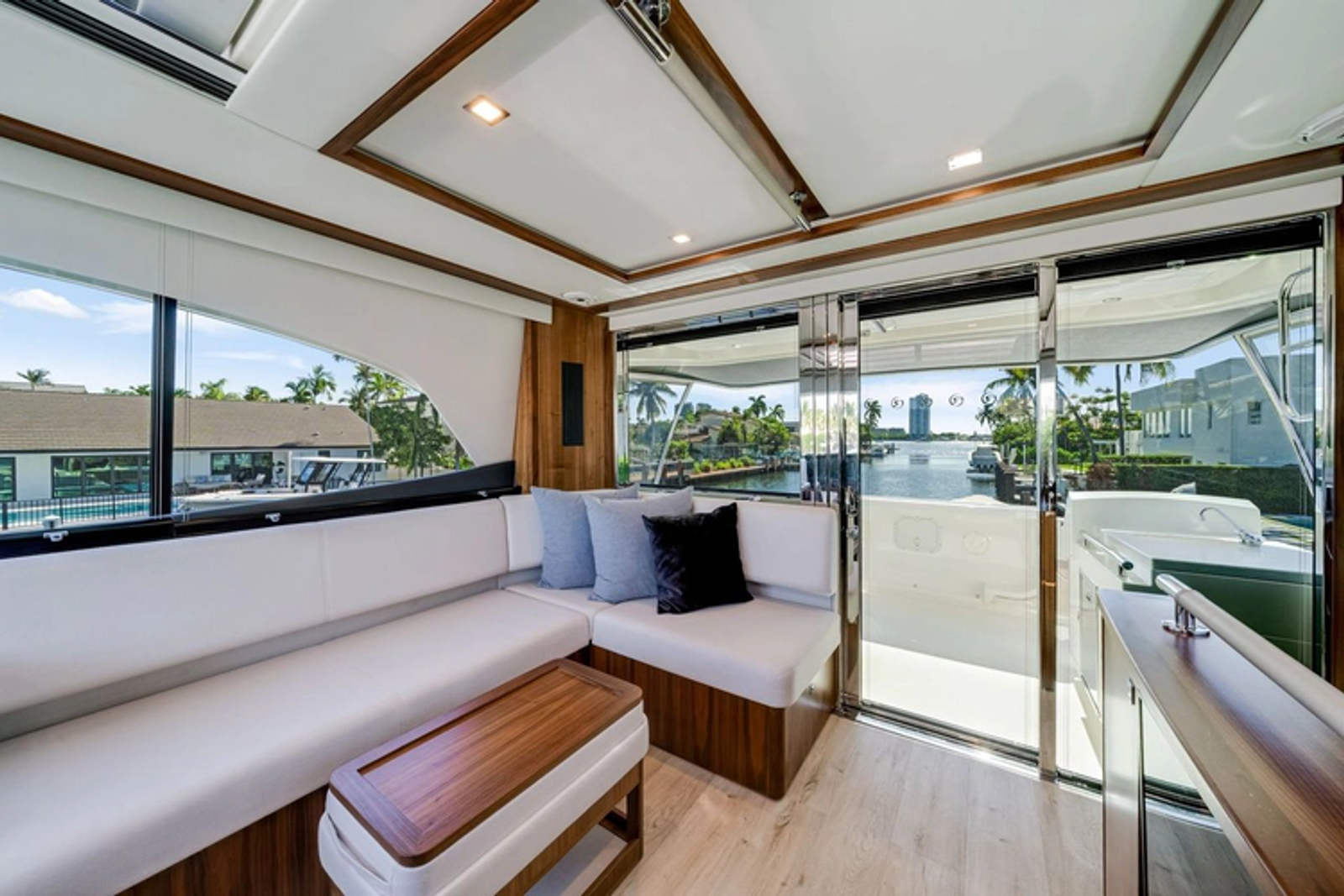 - Teak cockpit with mezzanine seating, drop-down TV & dual wet bars