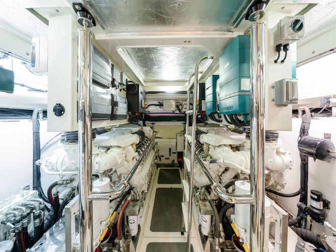 - Twin MAN V12 1550hp with joystick controls (helm, cockpit, flybridge)