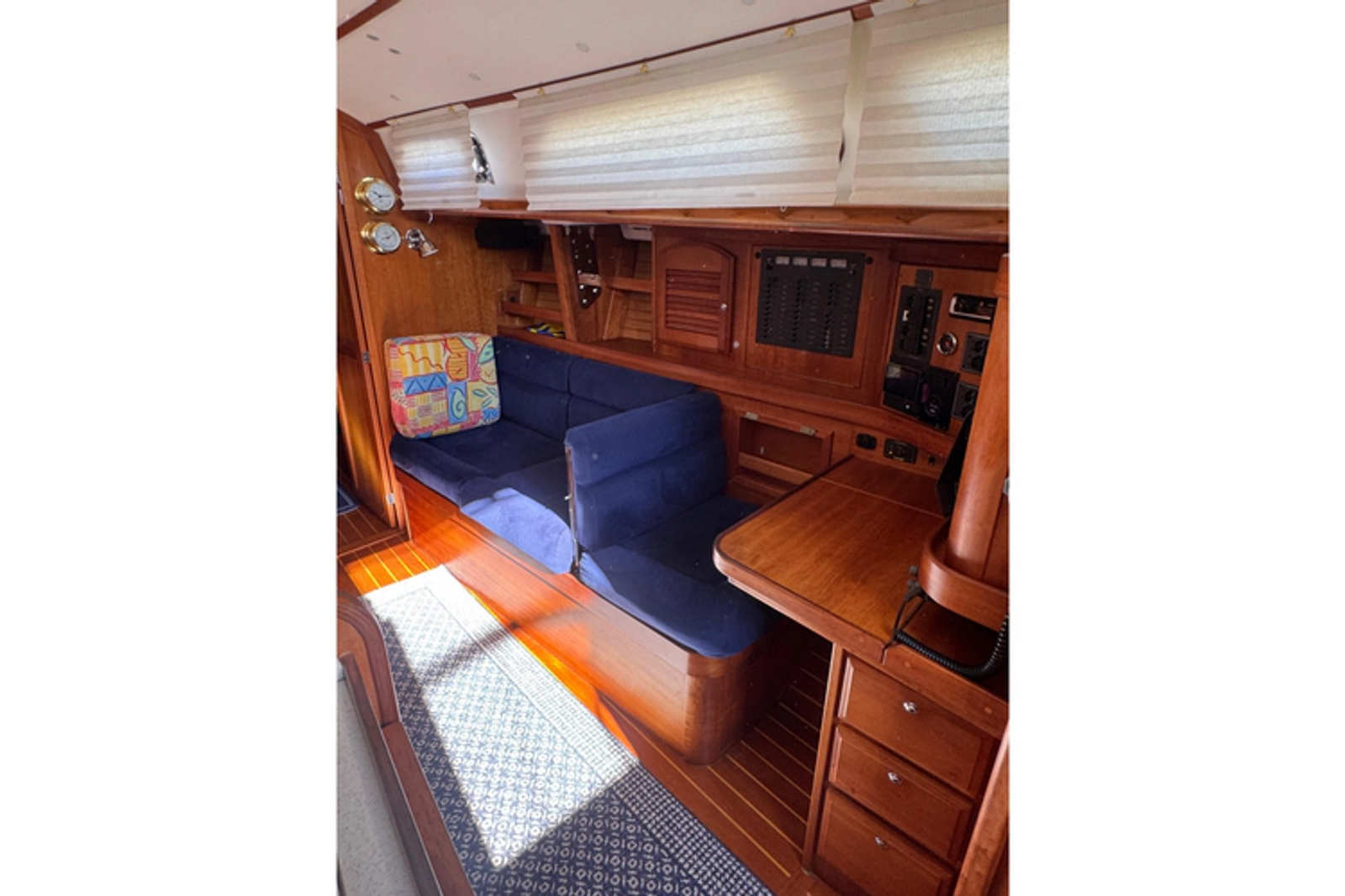 •Teak cockpit table with cushioned seating