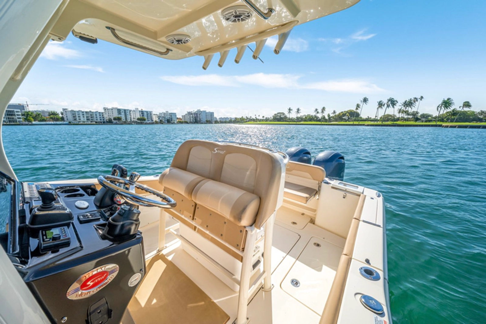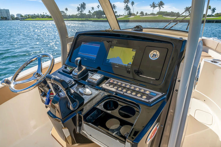 At the helm, the boat is equipped with Optimus electro-hydraulic power steering, joystick control, and SeaStation GPS positioning, giving it excellent maneuverability around the dock and added confidence underway.