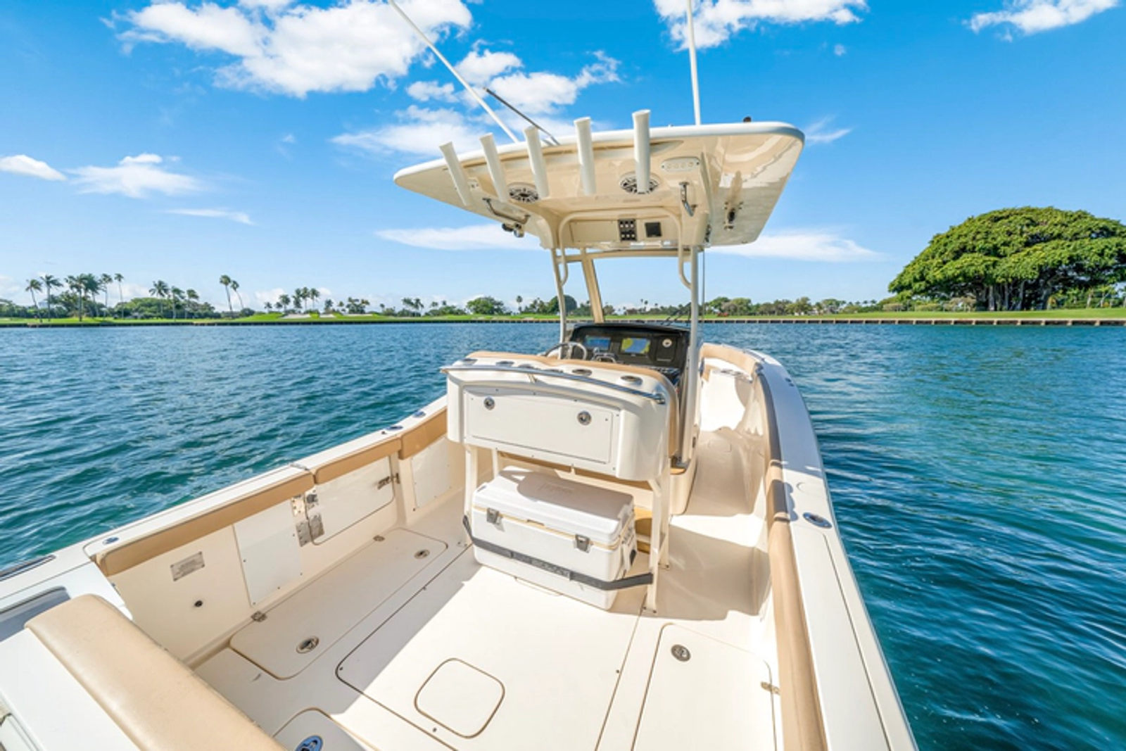 Outfitted with dual Garmin 8610 XSV multifunction displays, Garmin VHF, Garmin autopilot, Ritchie compass, Fusion stereo with remote, JL Audio speakers, and BocaTech switching, creating a modern and functional command center. The layout offers comfortable seating throughout, including twin helm seats with bolsters, forward console seating, wraparound bow seating with backrests, a removable bow table, and an aft folding bench seat. The enclosed console head adds convenience for family outings and day trips.
