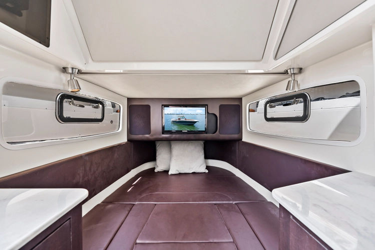 Enjoy effortless docking with Joystick control, and feel confident navigating any time of day with FLIR night vision and Garmin radar. At the helm, you'll find dual 16" Garmin multifunction displays, Mercury VesselView, and helm A/C for all-day comfort at the controls.