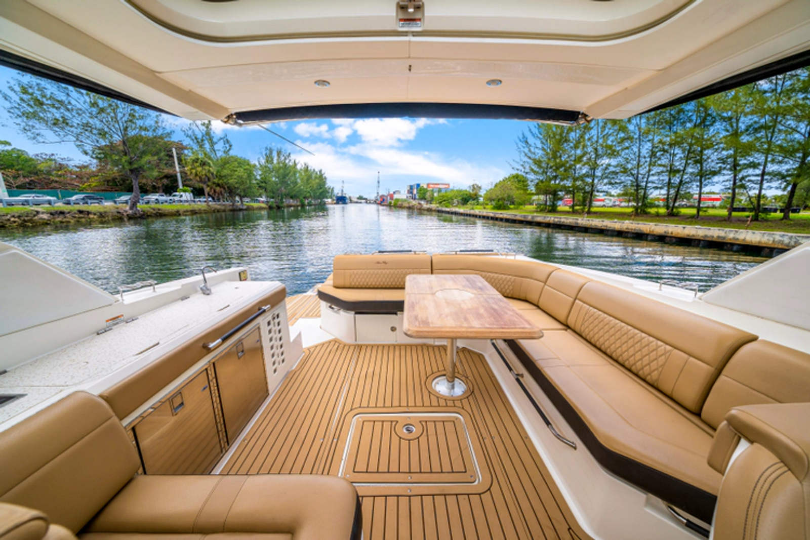- Cockpit galley with grill, refrigerator, and sink