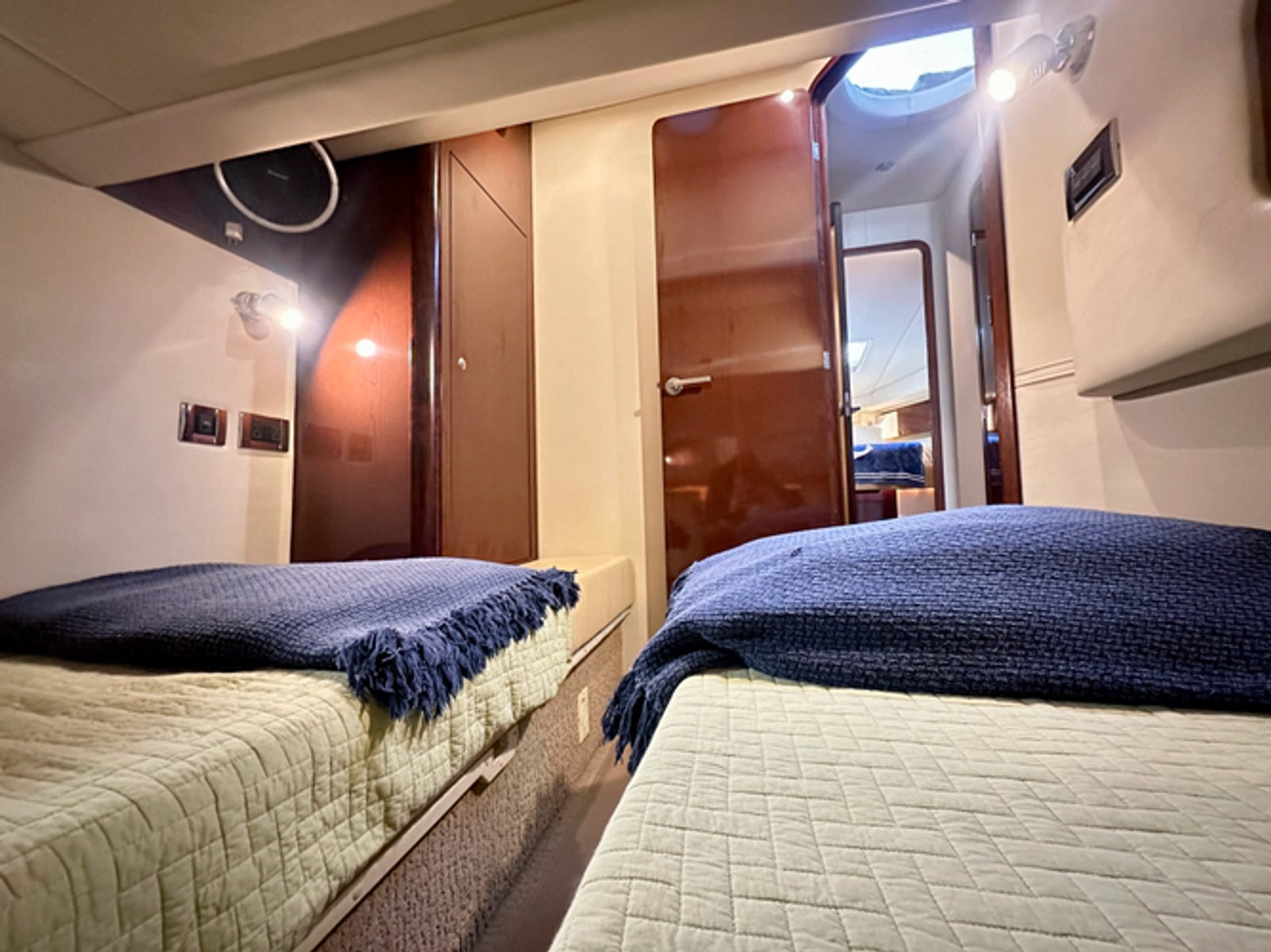 The Guest cabin is situated to port aft. Guests can choose twin beds or employ the provided filler cushions for a king-size bed. Forward stateroom features a full-size bed on centerline, cedar-lined hanging lockers, and an ideally located flat screen TV.