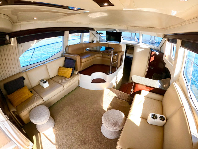 This 2009 Sea Ray 44, “PAPPA G”, is a pampered & clean Sedan Bridge that is turn-key for her next owners.A three-owner vessel originally based at an inland marina on the St. Johns River in Jacksonville, Florida, she was delivered to her 2nd owners on the Gulf in Pensacola and has remained in the area since 2020. Preferred Cummins QSC500 turbo diesels @1280 hours with Shaft Drive (No Pods) and Bow Thruster for easy docking. Dark Cherry Interior with Mystic Black Counter Tops and additional Refrigeration located in place of Combo Washer / Dryer. The custom Fly-Bridge aft bimini top greatly improves over the factory standard. Maintenance, operation, and housekeeping are superb. Air Conditioned Fly Bridge, LED Lighting throughout, UW lights, and updated Electronics. Note the recent photos are a true representation of her cleanliness and appeal—maintenance Records on File, along with previous surveys.