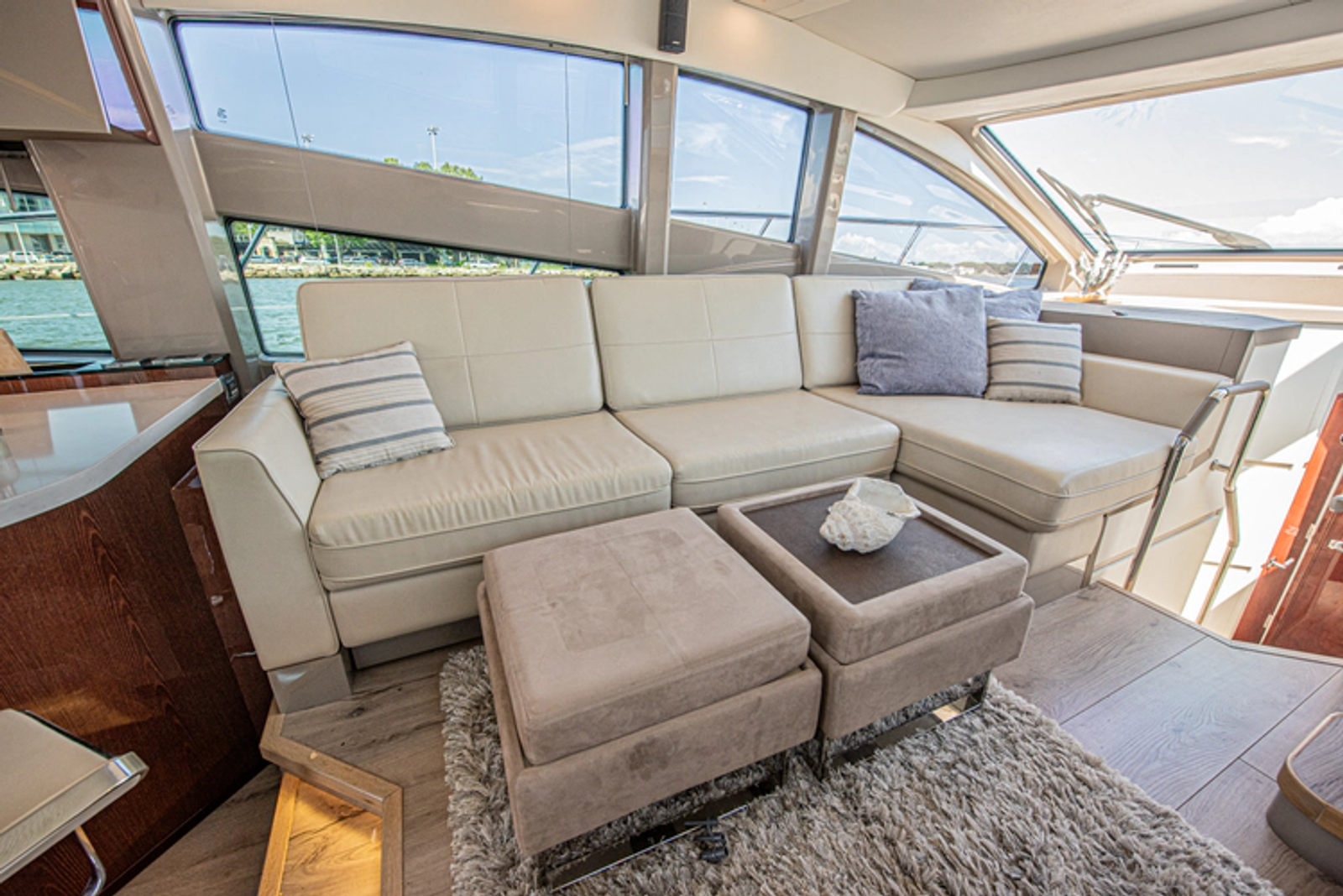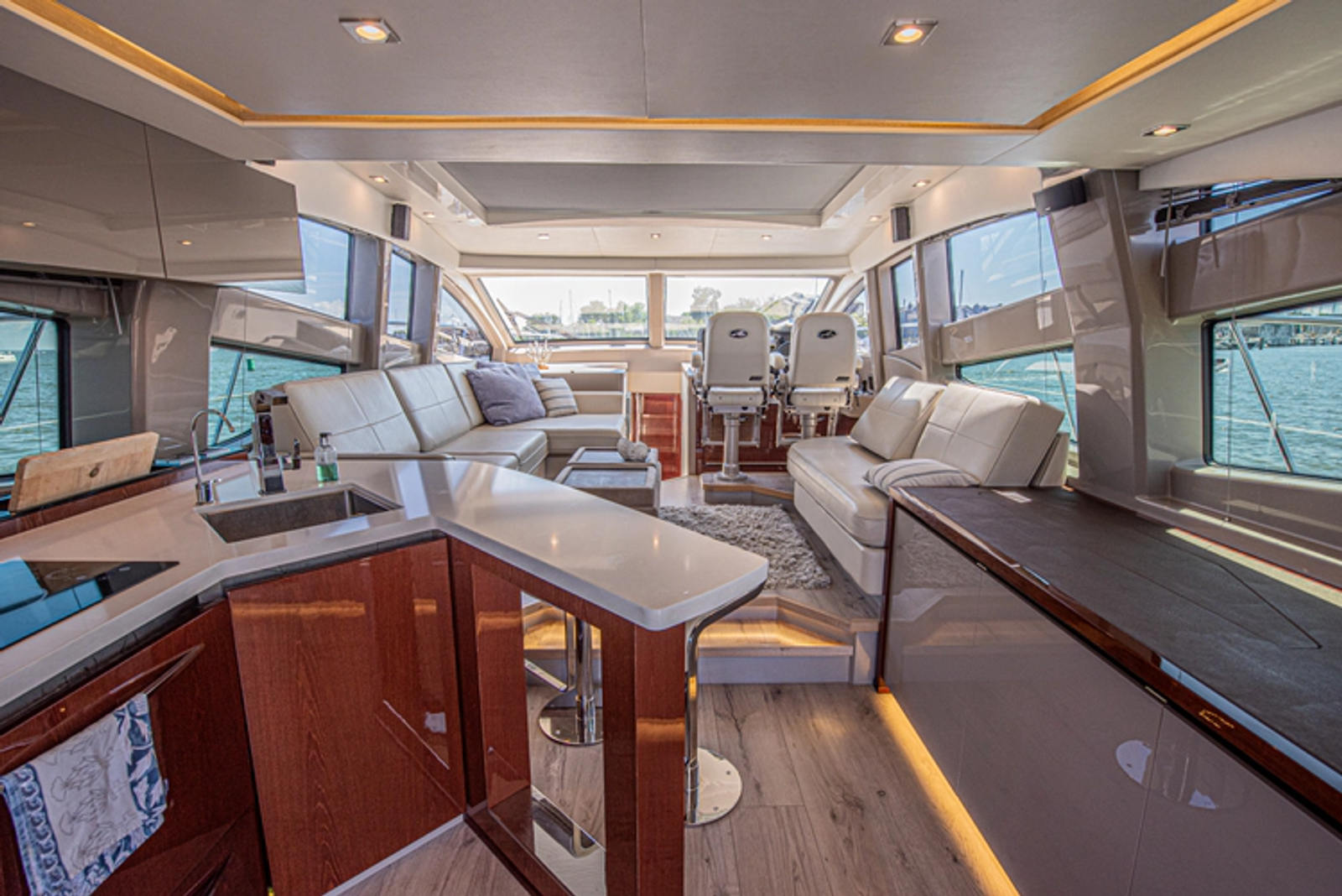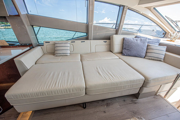 The entire salon can be basked in sunlight by opening the extra-large sunroof which also creates plenty of air flow while underway. It also has a sliding shade to keep the heat down on hot days.