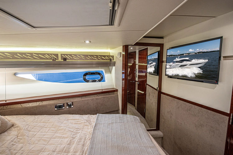 Below deck, the master stateroom is aft which eliminates the noise of hull slap and gives the owner a true walk around bed. The stateroom feels much larger than most aft masters in this size range because Sea Ray cleverly offset the bed in the aft starboard corner. This gives the benefit of a true island style, walkaround bed but also increases the open floor space in the stateroom.