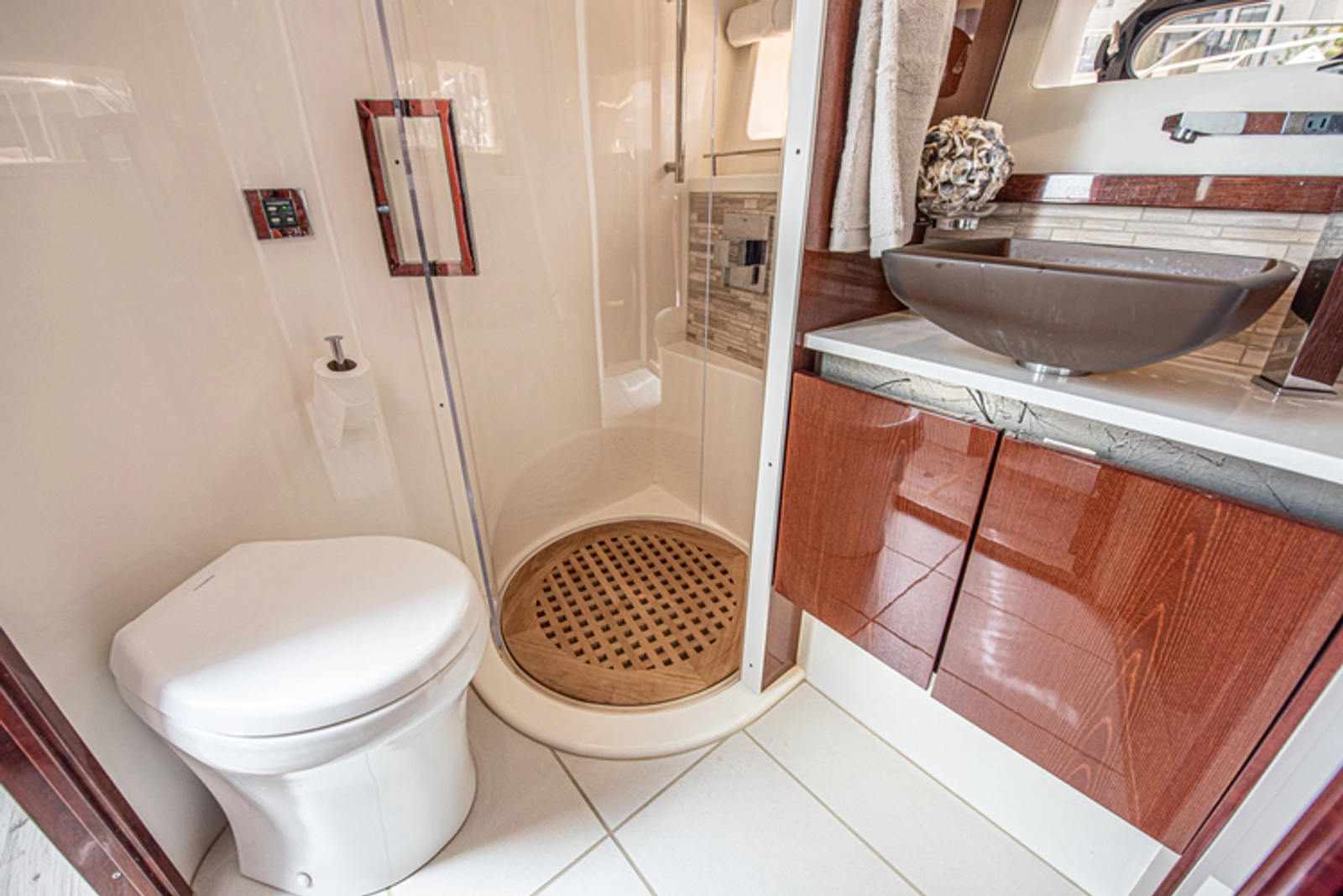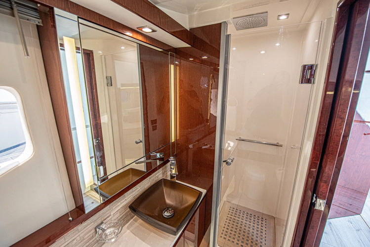 The day head is accessed through the lower deck corridor or the ensuite access in the VIP stateroom. Dressed in the same finishes and luxury as the master head, the day head has a circular shower stall that when not in use, opens to increase the floorplan of the head.