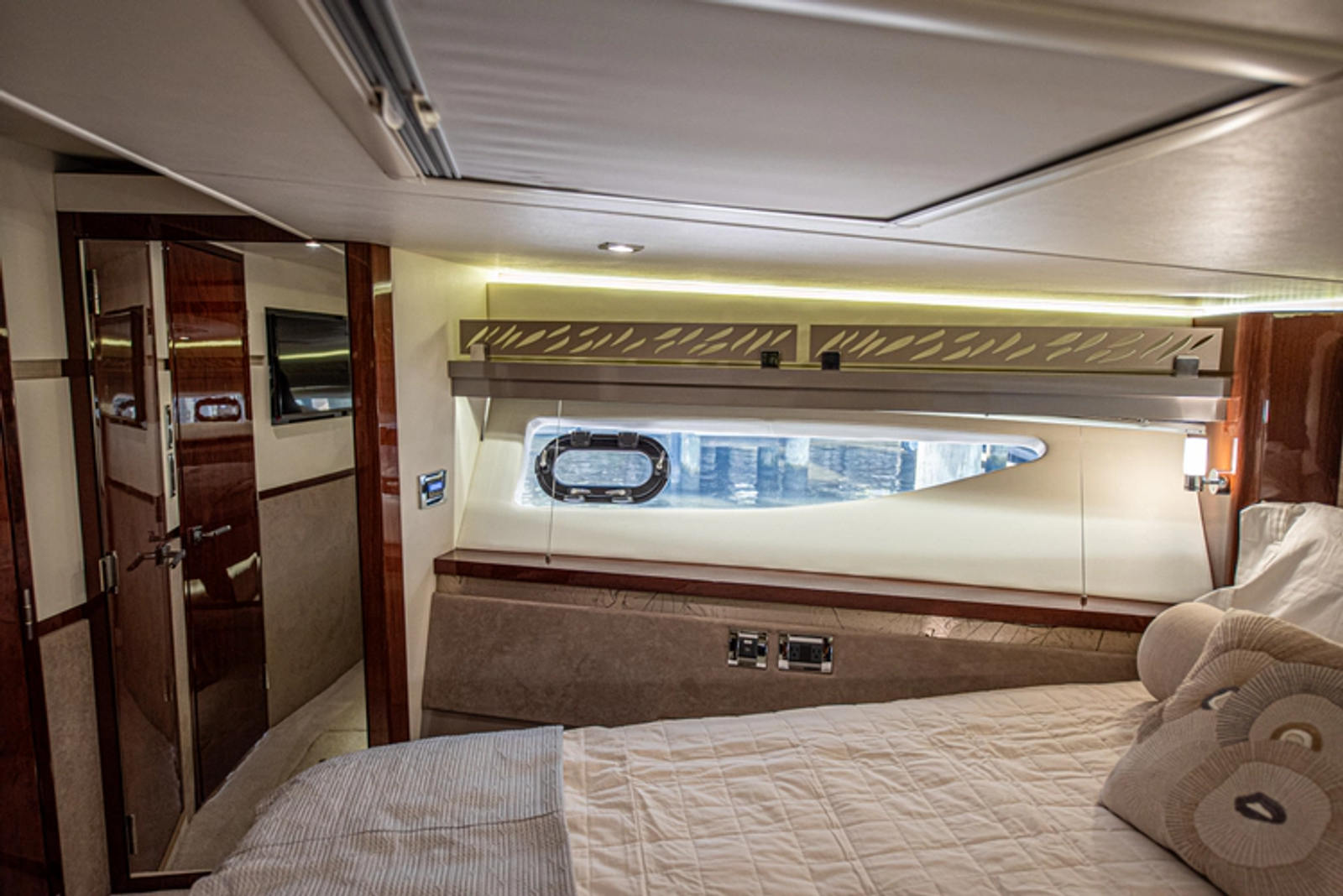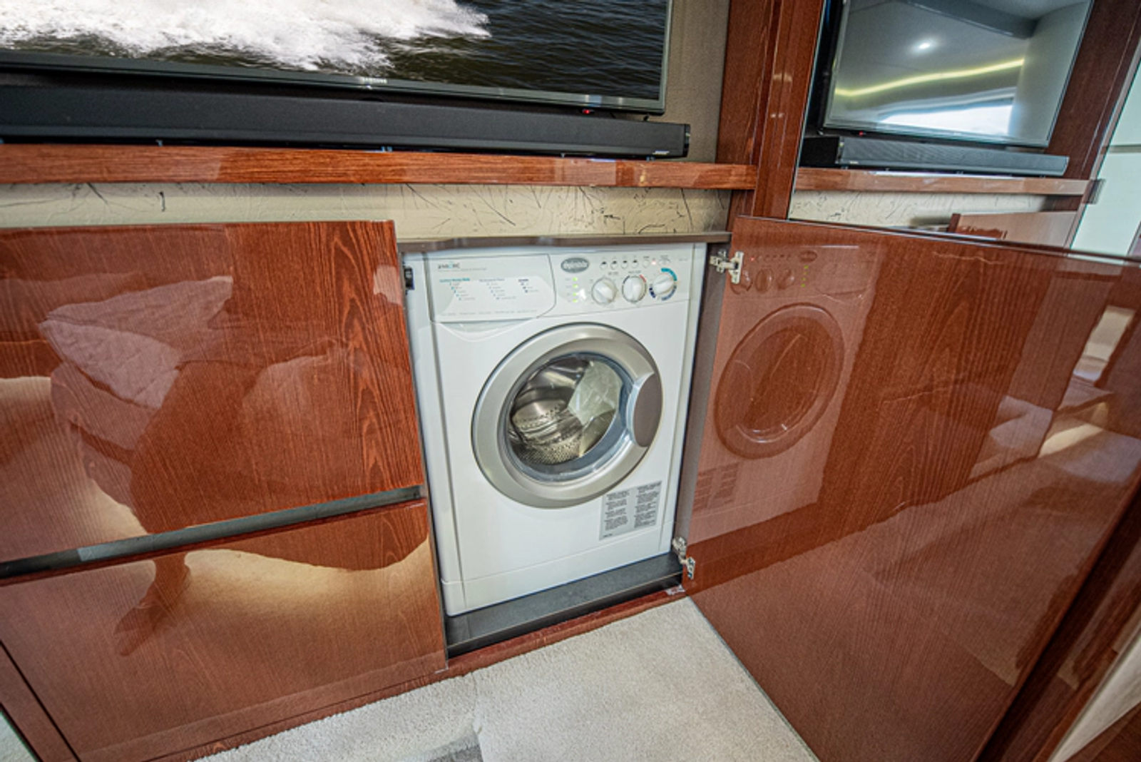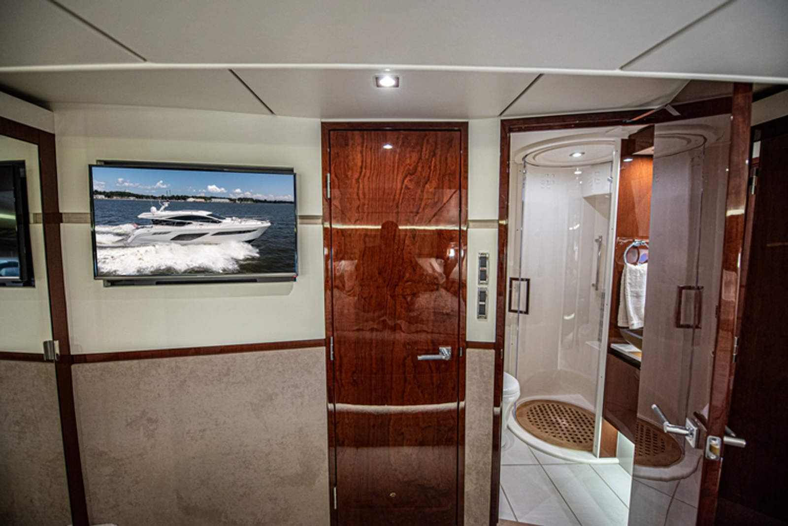 Opposite the galley are lacquered storage cabinets and an Isotherm wine fridge, along with the vessel’s main distribution panel for electrical switching, easily accessed just inside the salon door. A high-low Television is cleverly hidden and raises by just turning on the TV and Bose surround CineMate system.