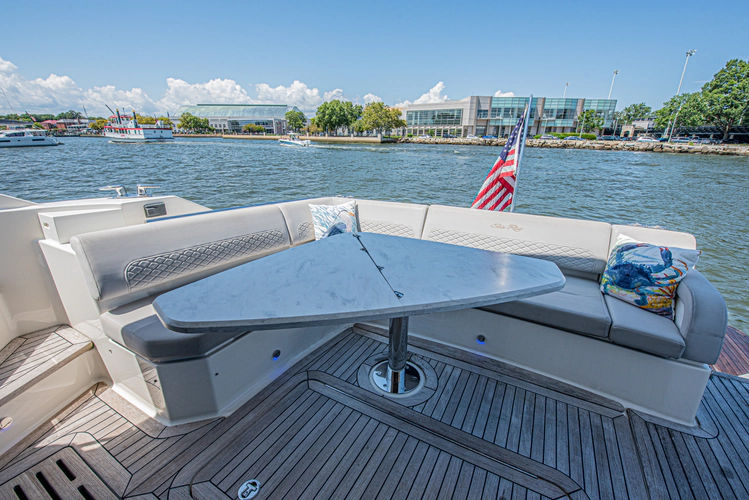 - Teak flooring – cockpit, foredeck seating area, swim platform