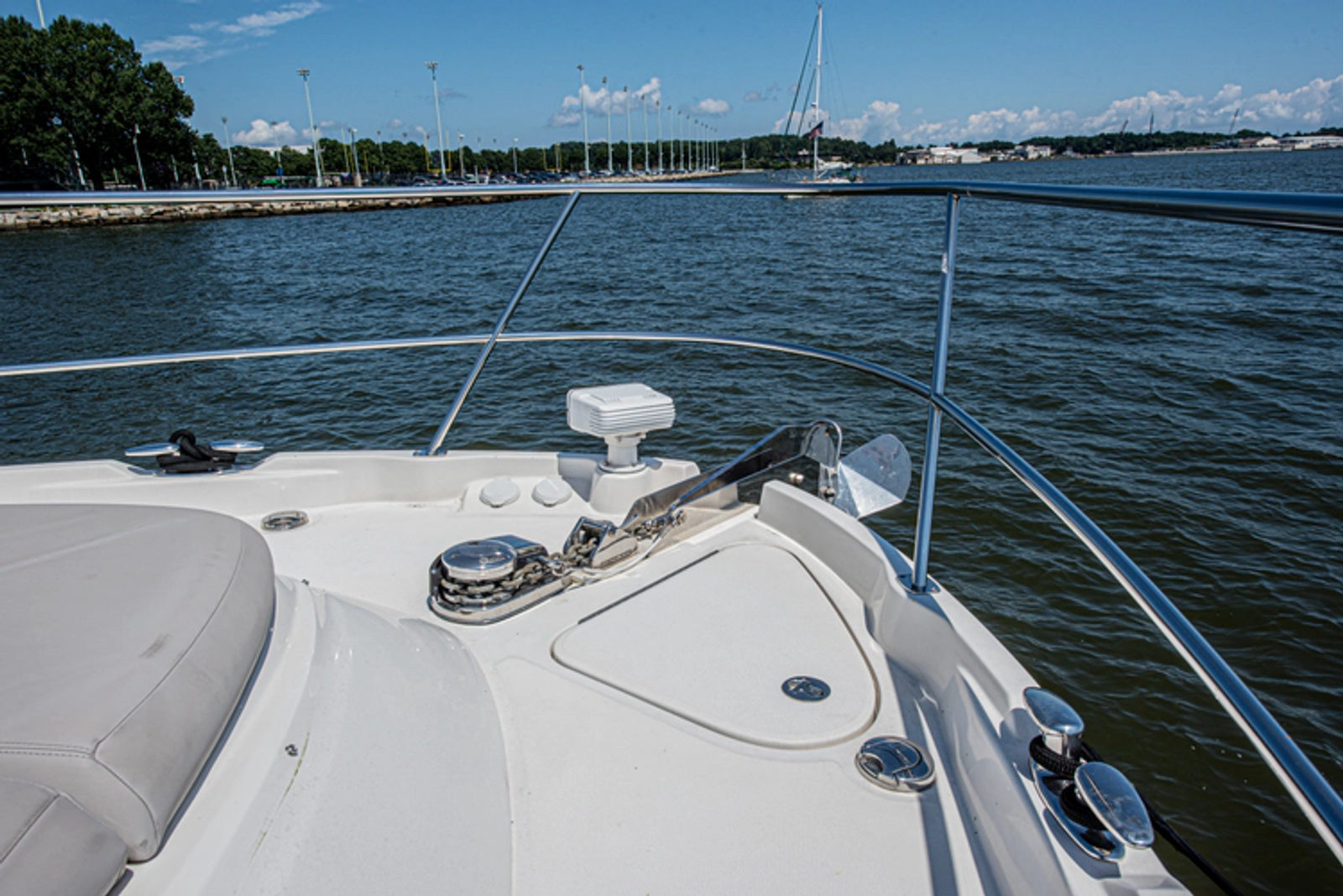The foredeck has elevated bulwarks to keep those lounging on the bow secure and adds style to the exterior lines of the boat. An ACR spotlight and windlass with stainless steel anchor and foot pedals are all easily accessible.