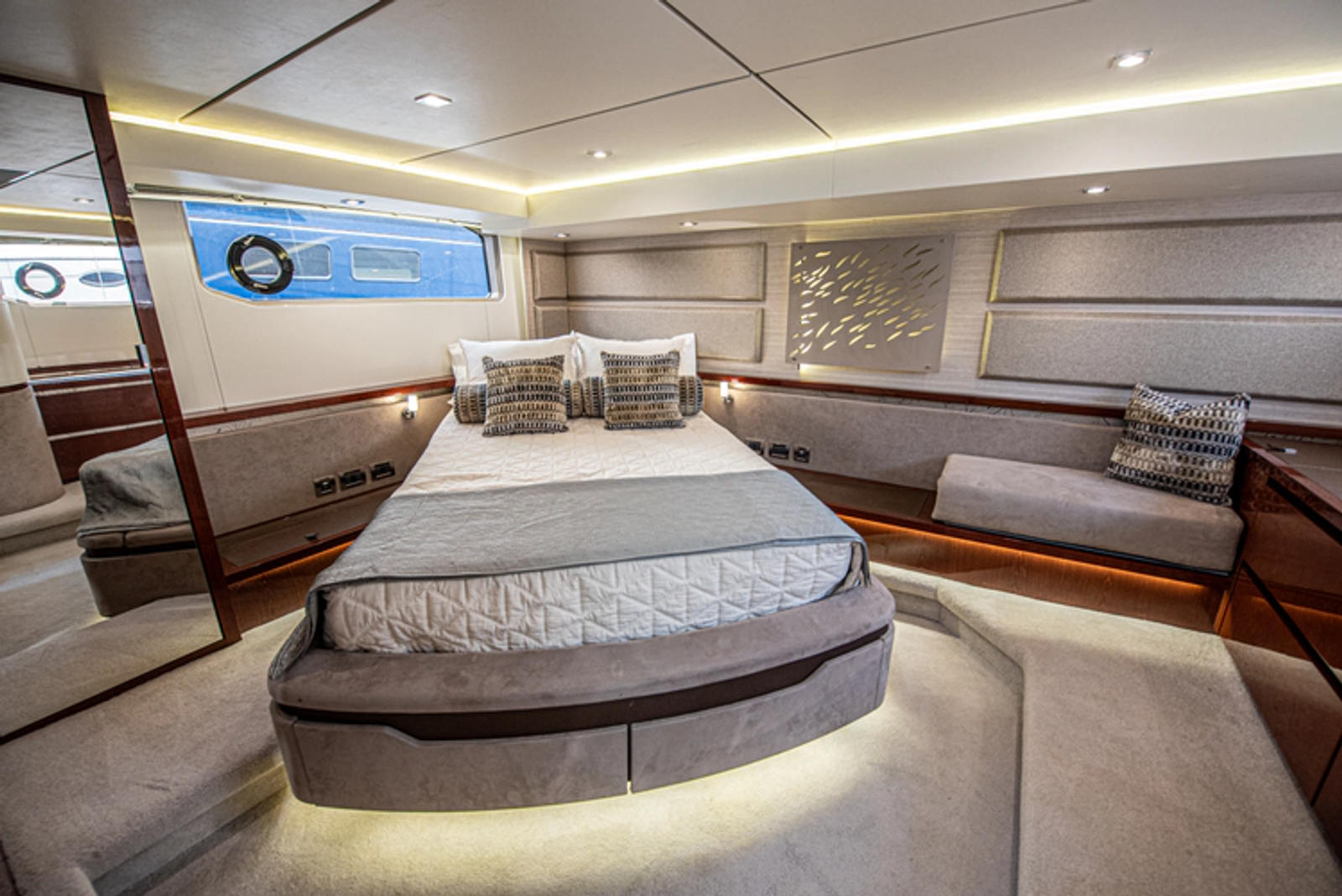A false floor is intuitively hidden and drops down to increase visibility when standing at the helm. Glendinning binnacles and inboard joystick system are conveniently placed near the outboard arm rest of the captain’s seat.